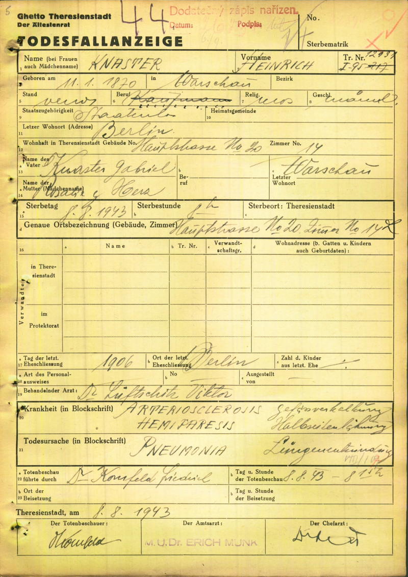 Knaster Chaim Heinrich: Todesfallanzeige, Ghetto Theresienstadt