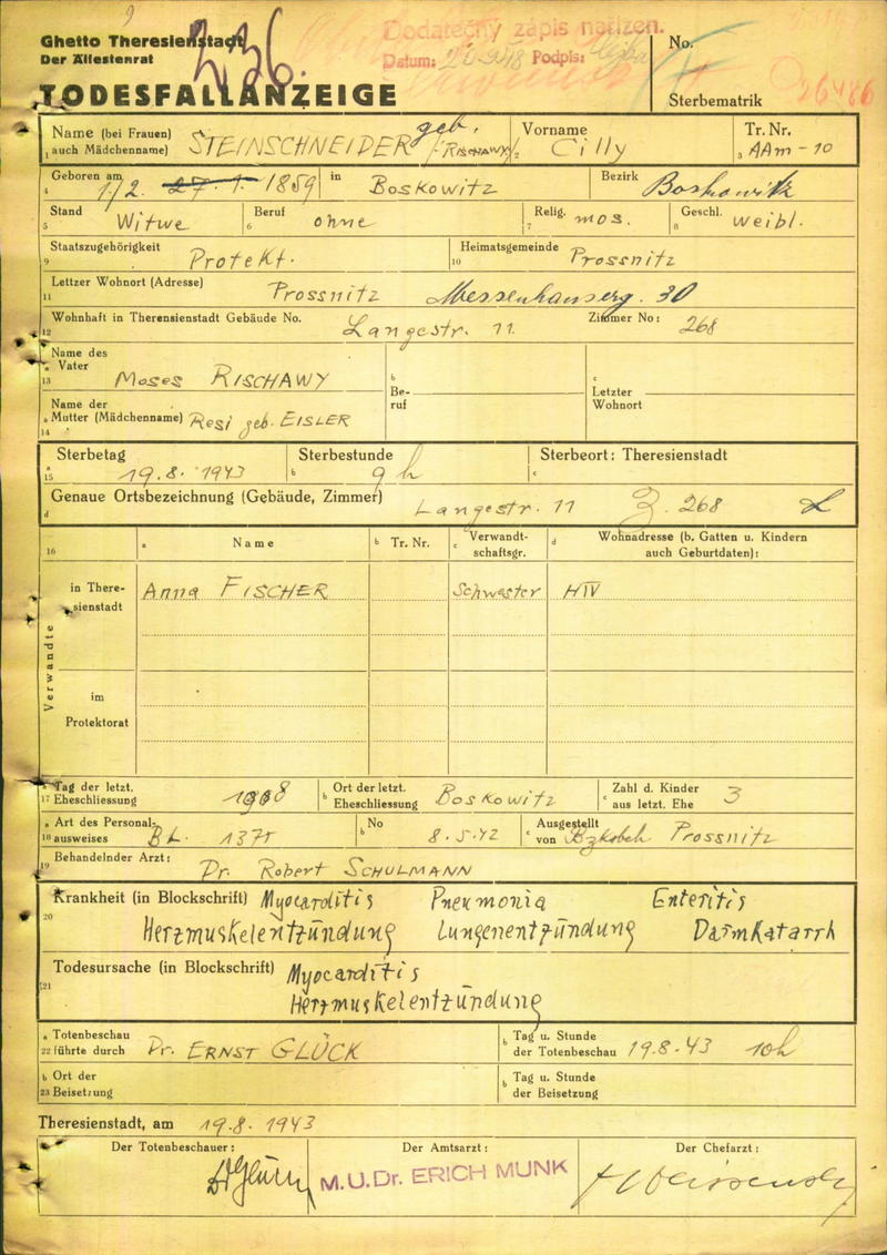 Steinschneiderová Cilla: Todesfallanzeige, Ghetto Theresienstadt