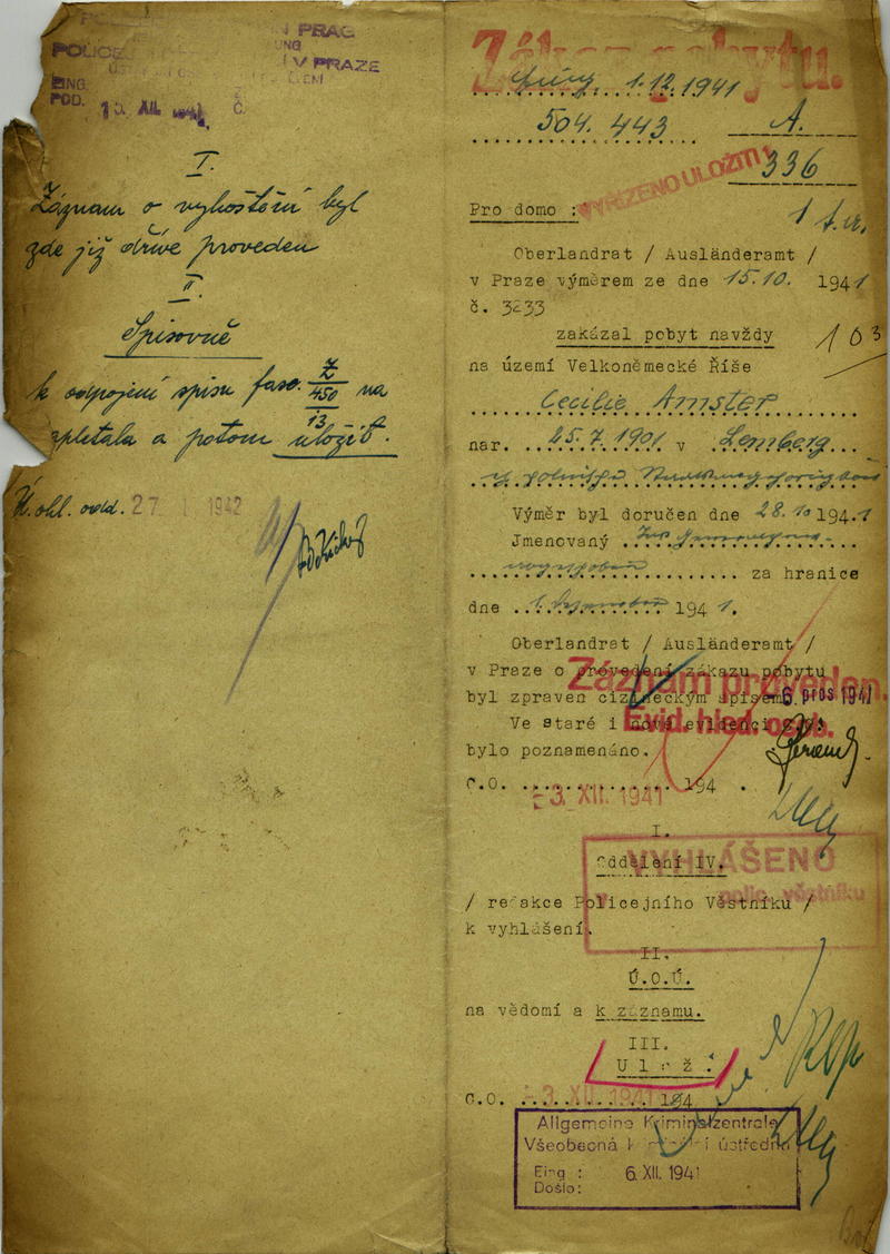 Amsterová Cäcilie: Záznam: zákaz pobytu na území Velkoněmecké říše