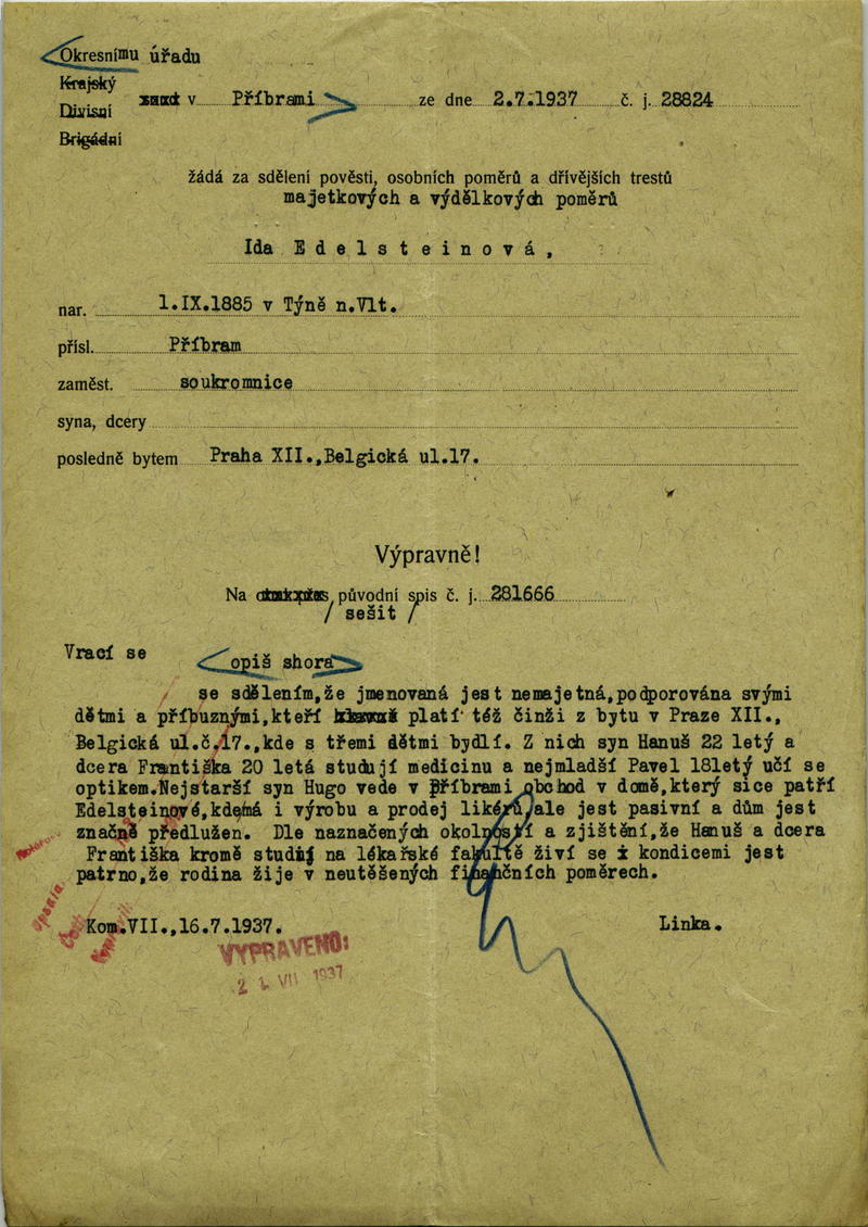 Edelsteinová Ida: Žádost o prošetření majetkových a výdělkových poměrů