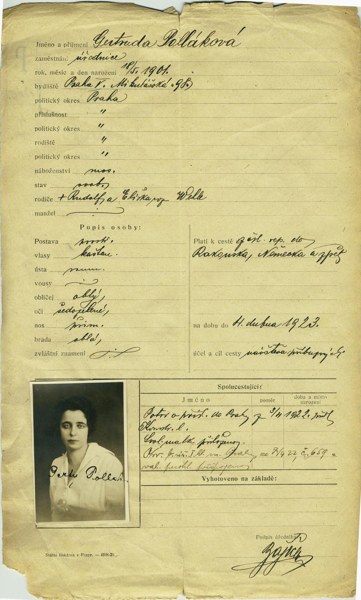 Eisnerová Gertruda: Žádost o vydání cestovního pasu