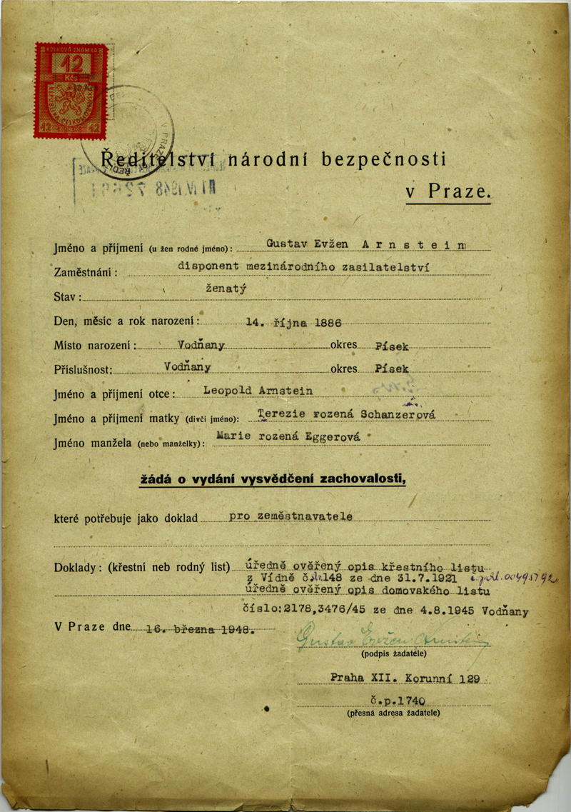 Arnstein Gustav: Žádost o vystavení vysvědčení zachovalosti