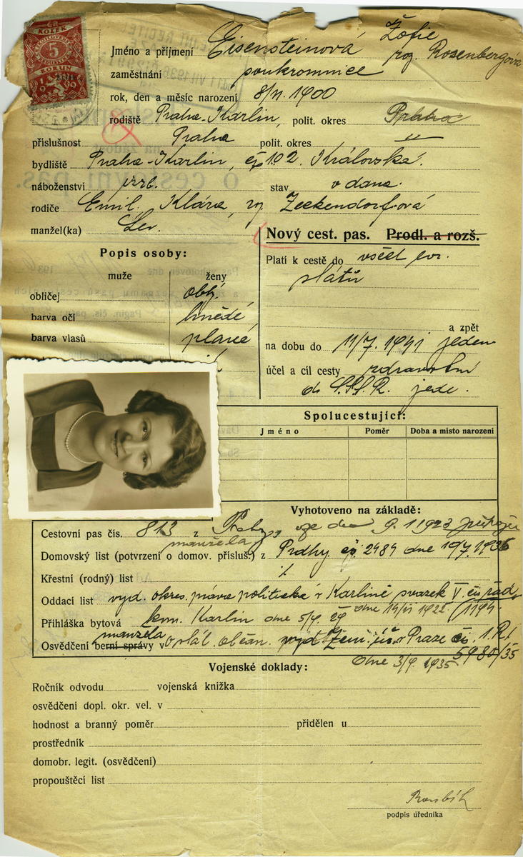 Eisensteinová Žofie: Žádost o vydání cestovního pasu