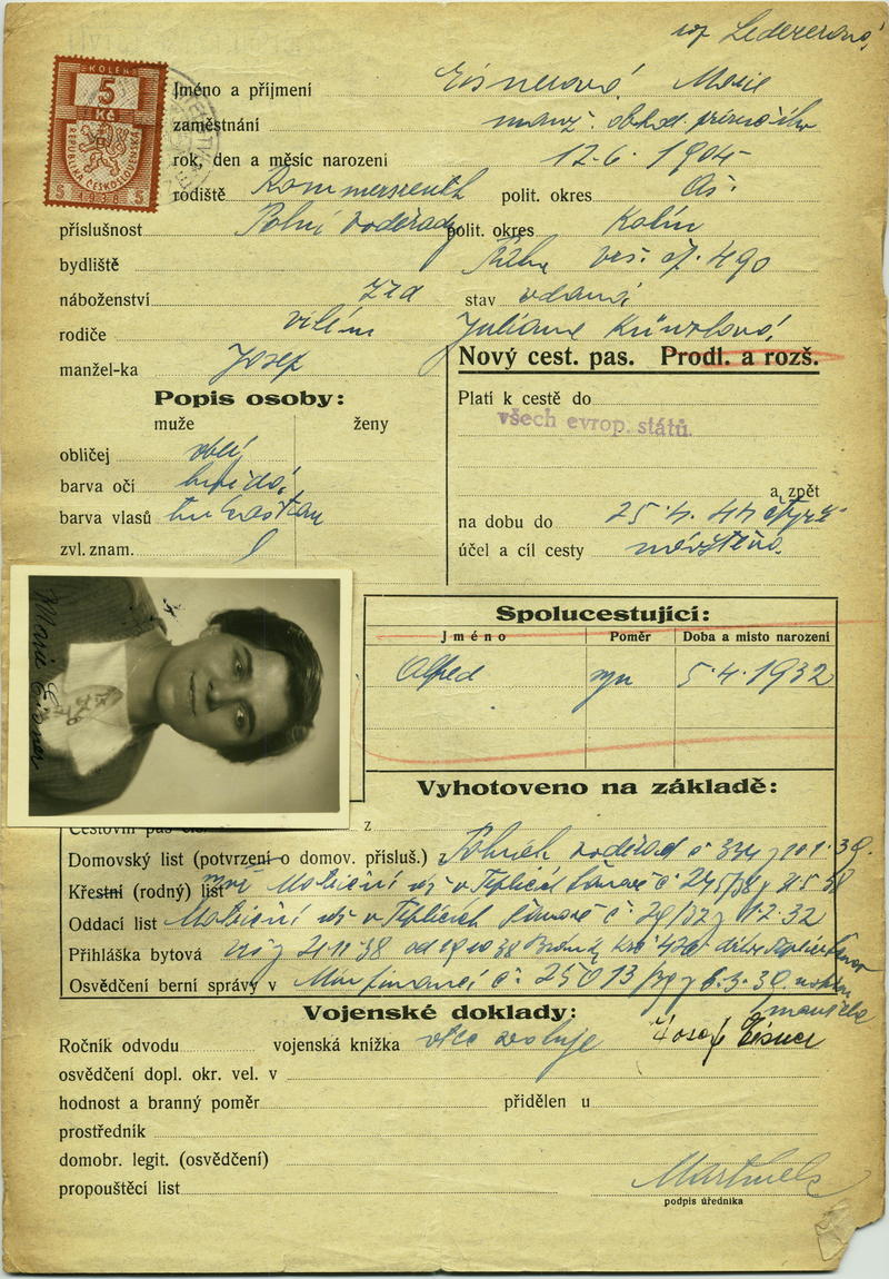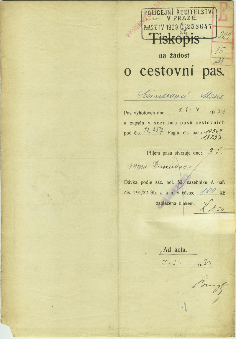 Eisnerová Marie: Žádost o vydání cestovního pasu