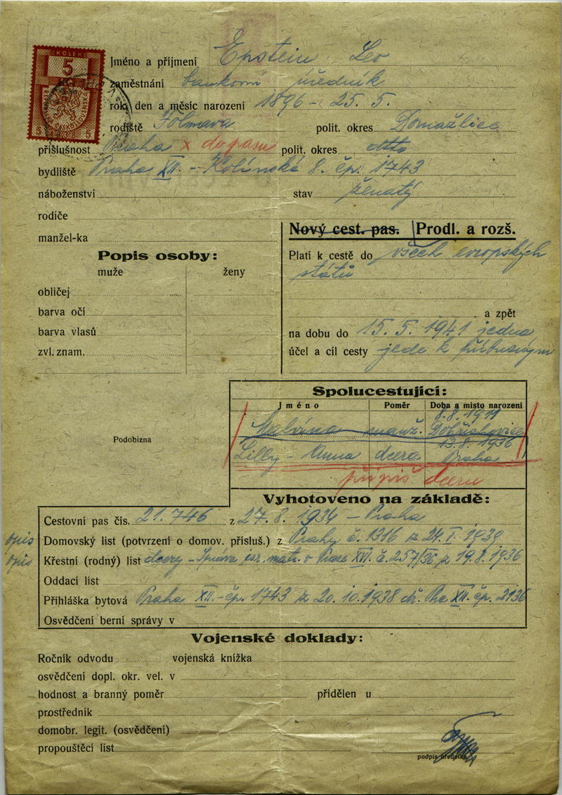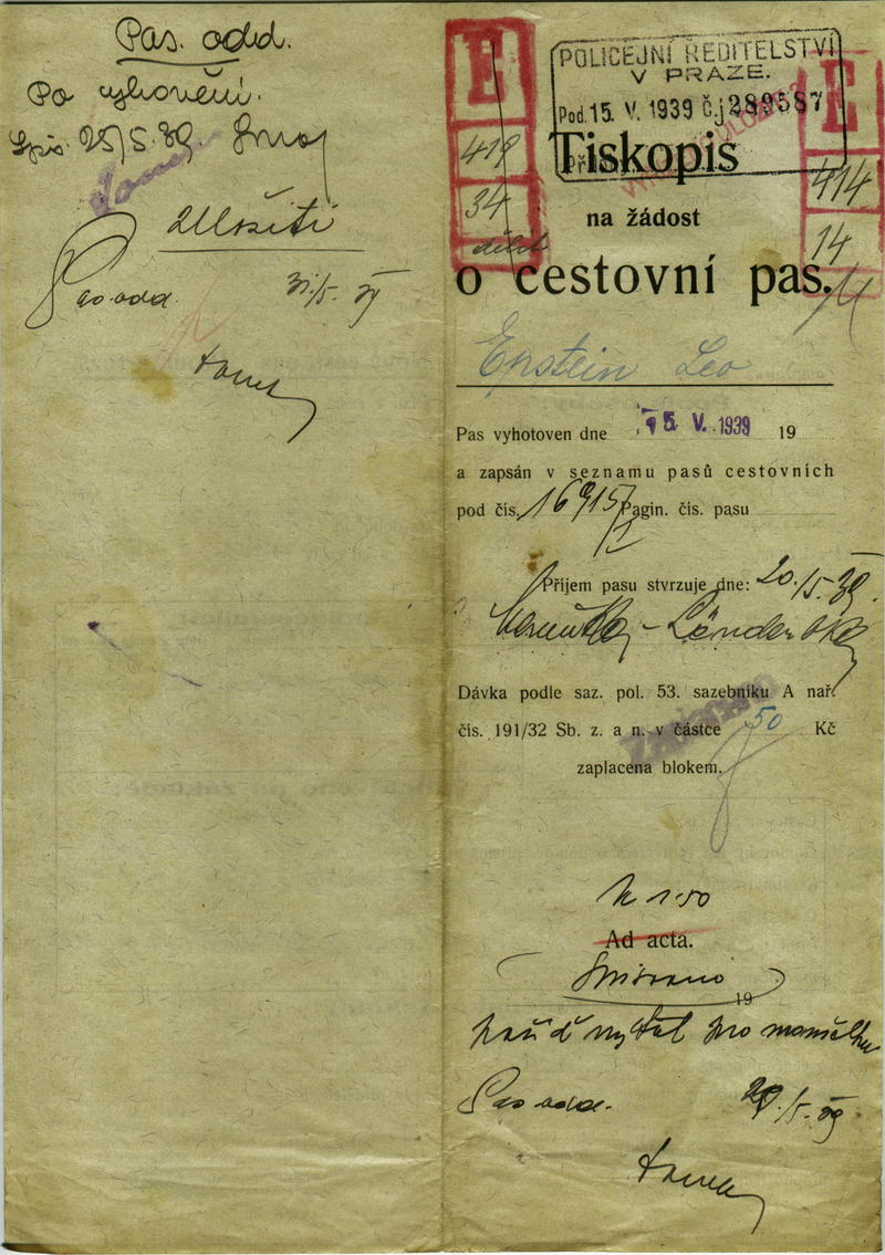 Epstein Leo: Žádost o prodloužení a rozšíření cestovního pasu
