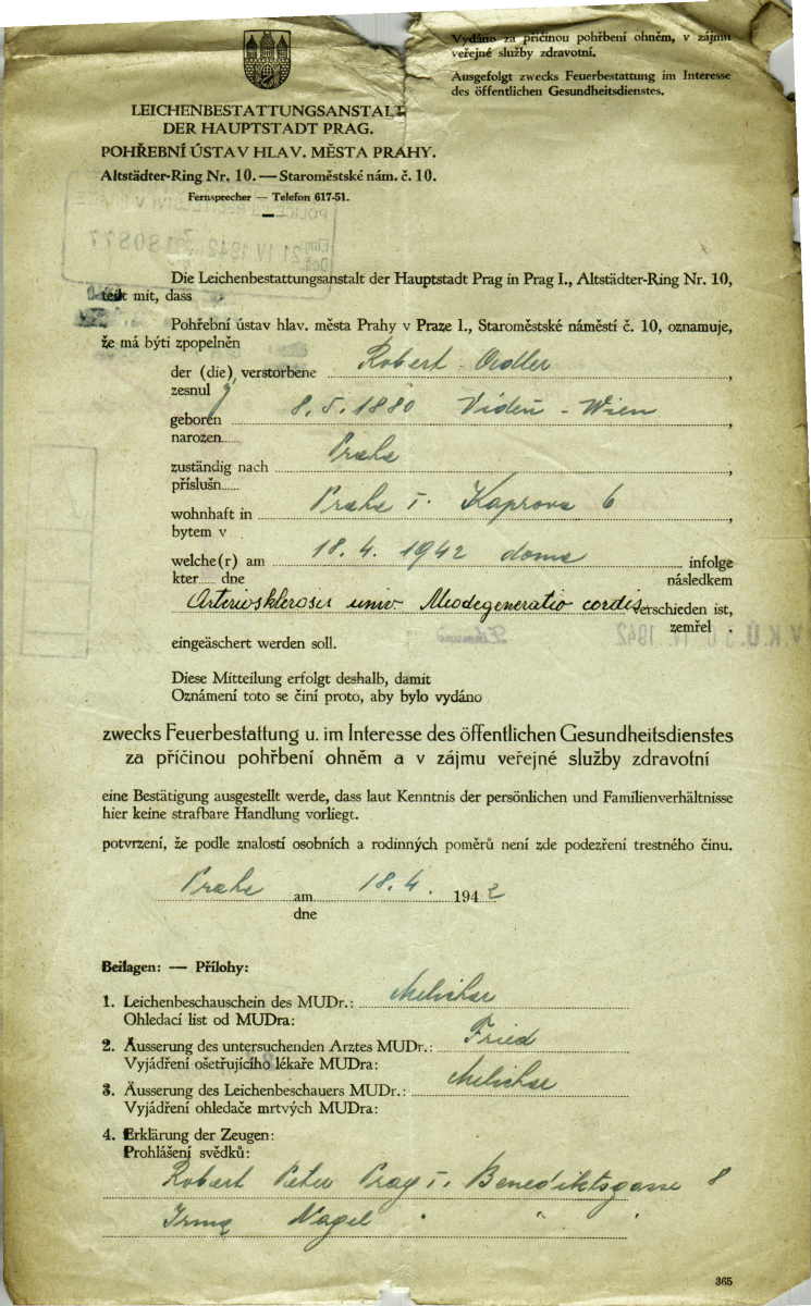 Adler Robert: Žádost o potvrzení k pohřbení ohněm