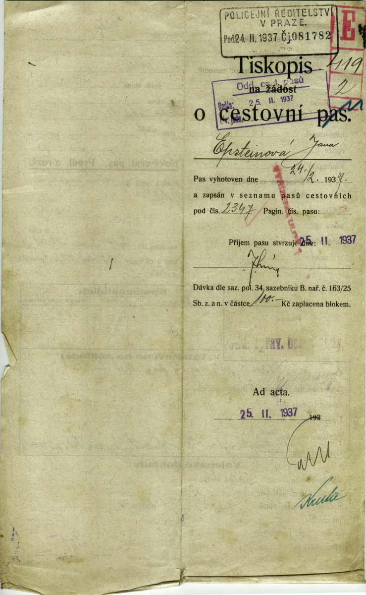 Epsteinová Hana: Žádost o prodloužení a rozšíření cestovního pasu
