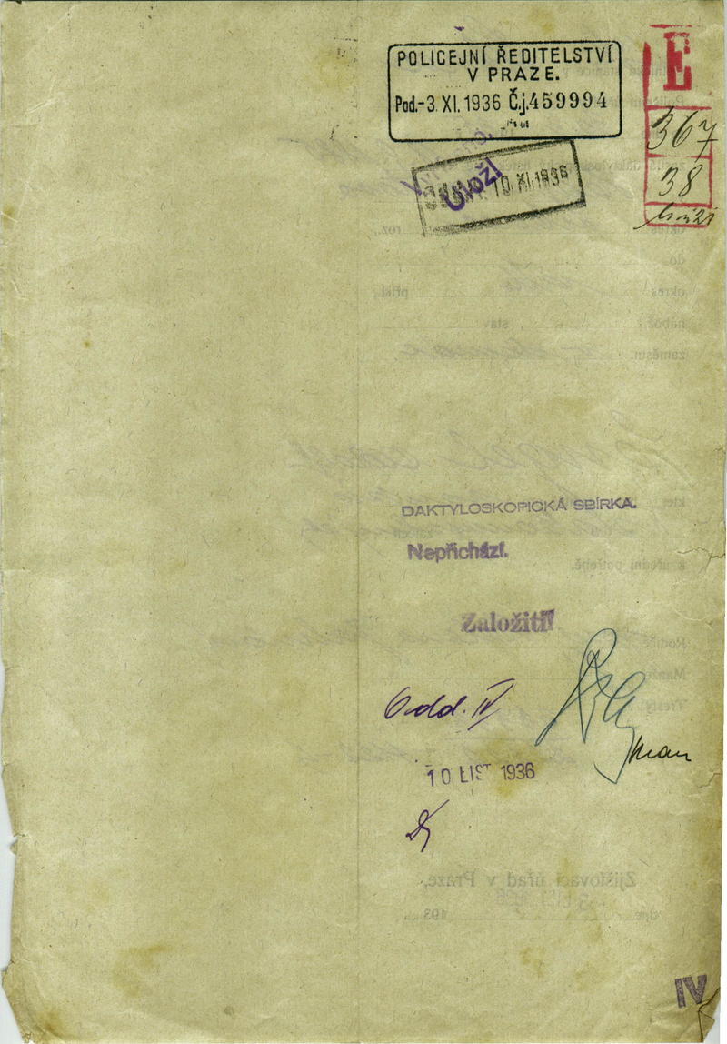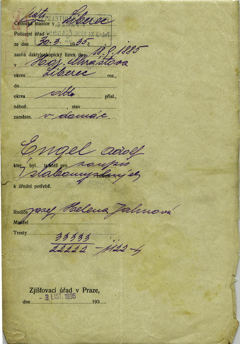 Engel Adolf: Zpráva o zaslání daktyloskopického lístku