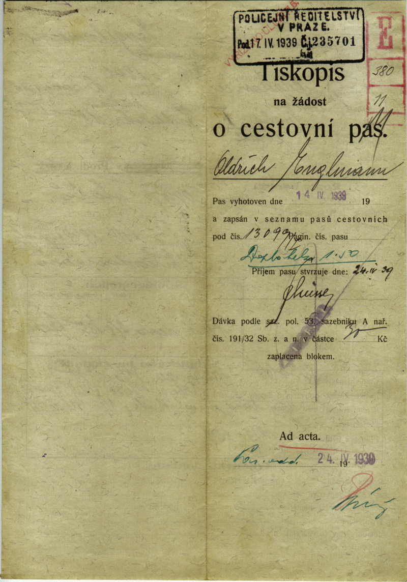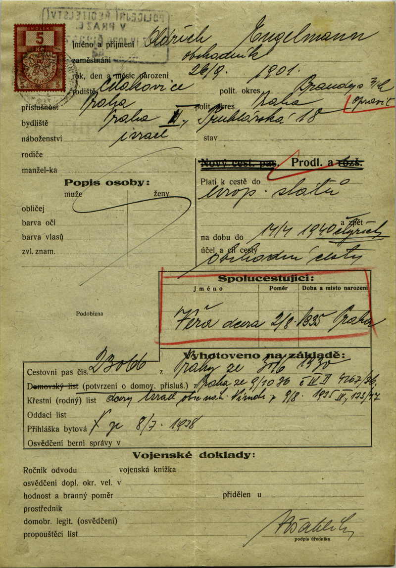 Engelmann Oldřich: Žádost o prodloužení cestovního pasu