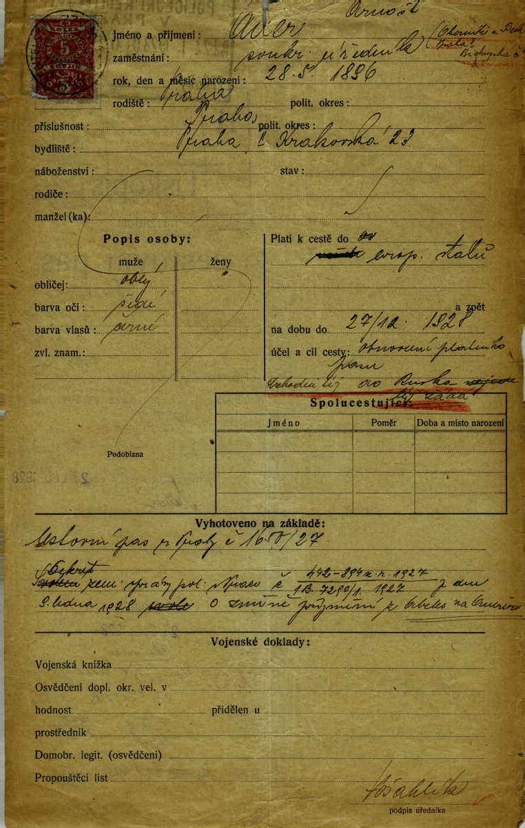 Auer Arnošt: Žádost o obnovení cestovního pasu
