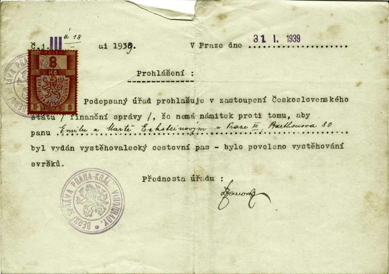 Eckstein Emil: Vyjádření k žádosti o vydání cestovního pasu