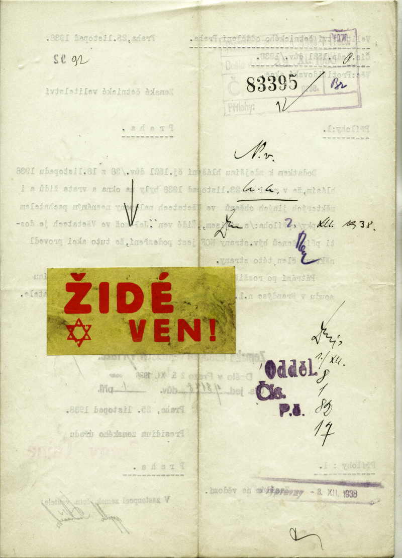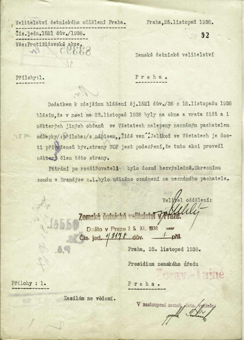 Hlášení četnictva o protižidovských nálepkách ve Všetatech