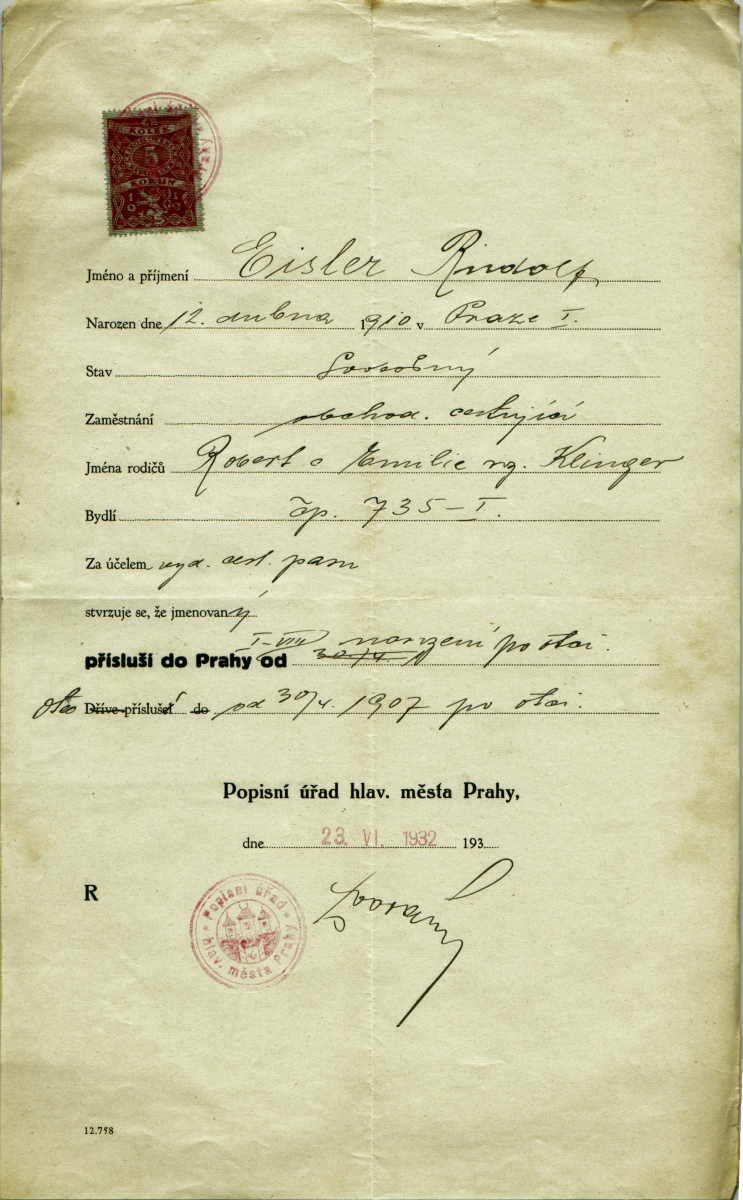 Eisler Rudolf: Potvrzení domovské příslušnosti