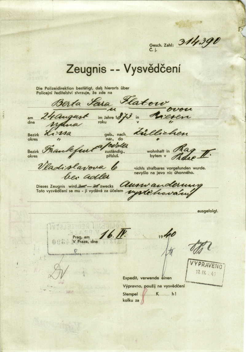 Flatowá Berta Sarah: Vysvědčení zachovalosti