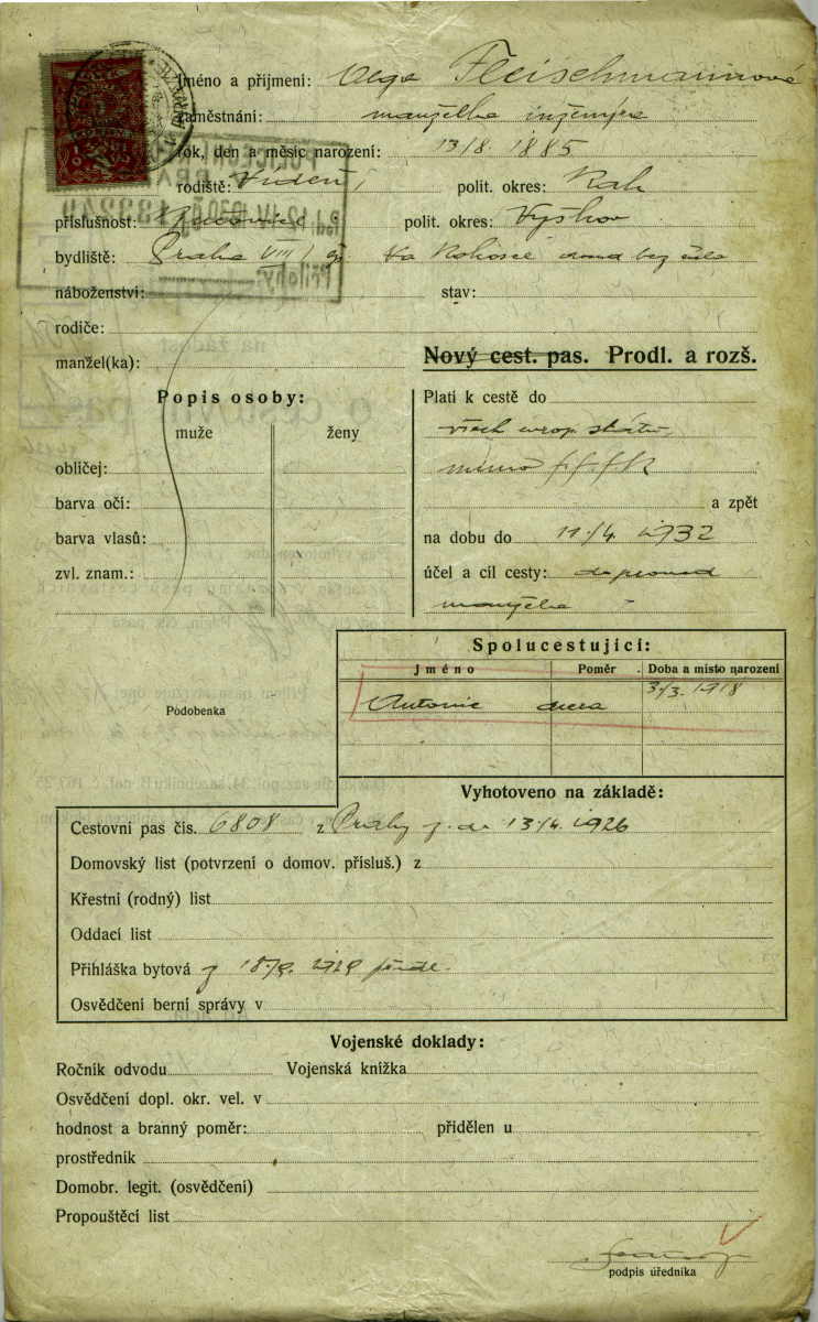 Fleischmannová Olga: Žádost o prodloužení a rozšíření cestovního pasu