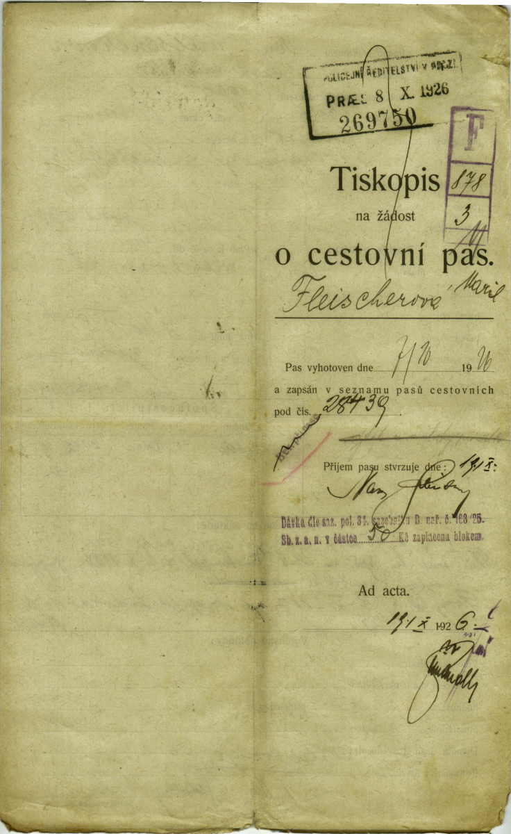 Fleischerová Marie: Žádost o prodloužení a rozšíření cestovního pasu