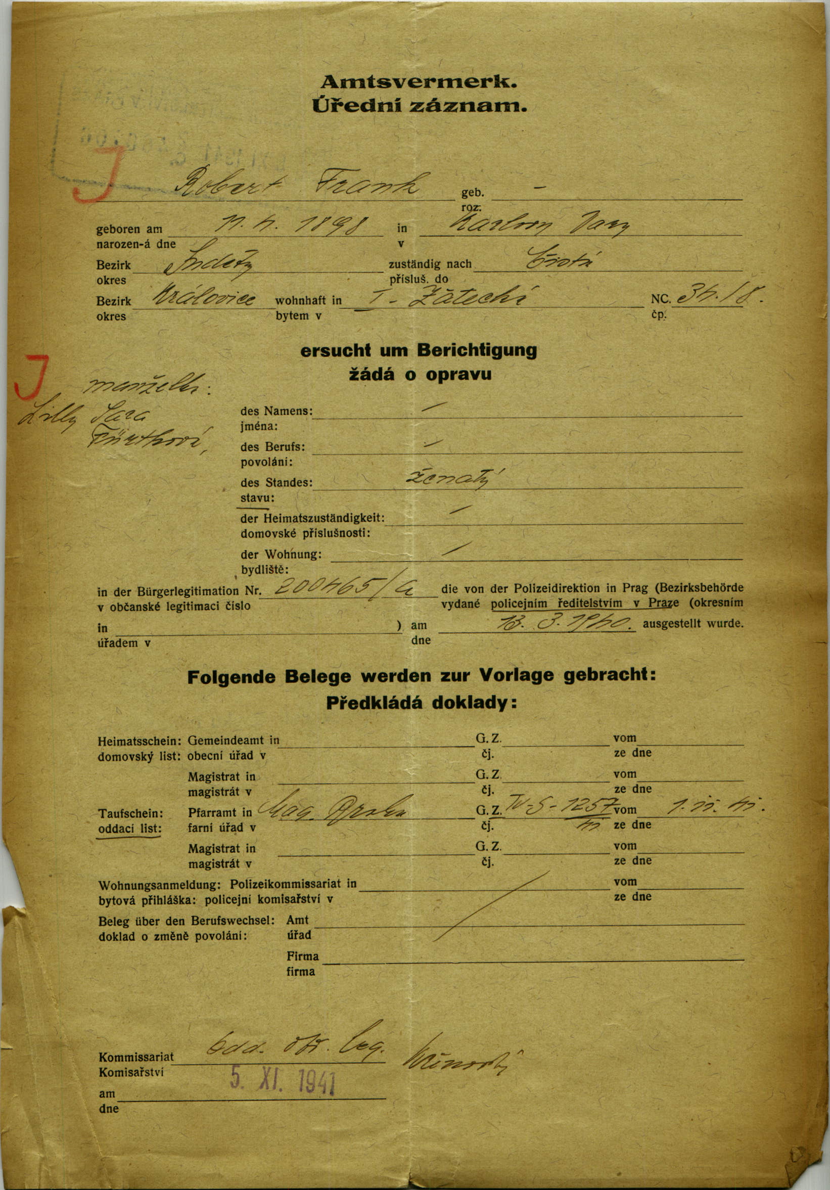 Frank Robert: Žádost o opravu v občanské legitimaci