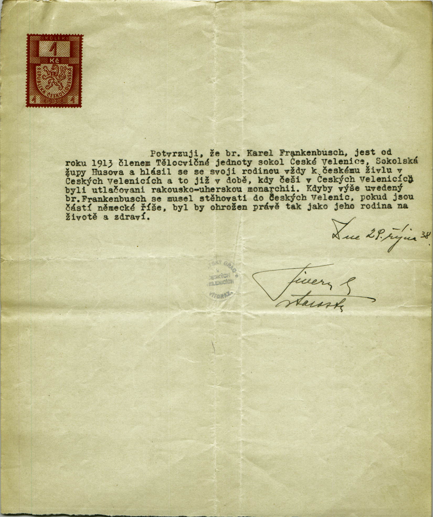 Frankenbusch Karel: Potvrzení o nemožnosti návratu do dřívějšího bydliště