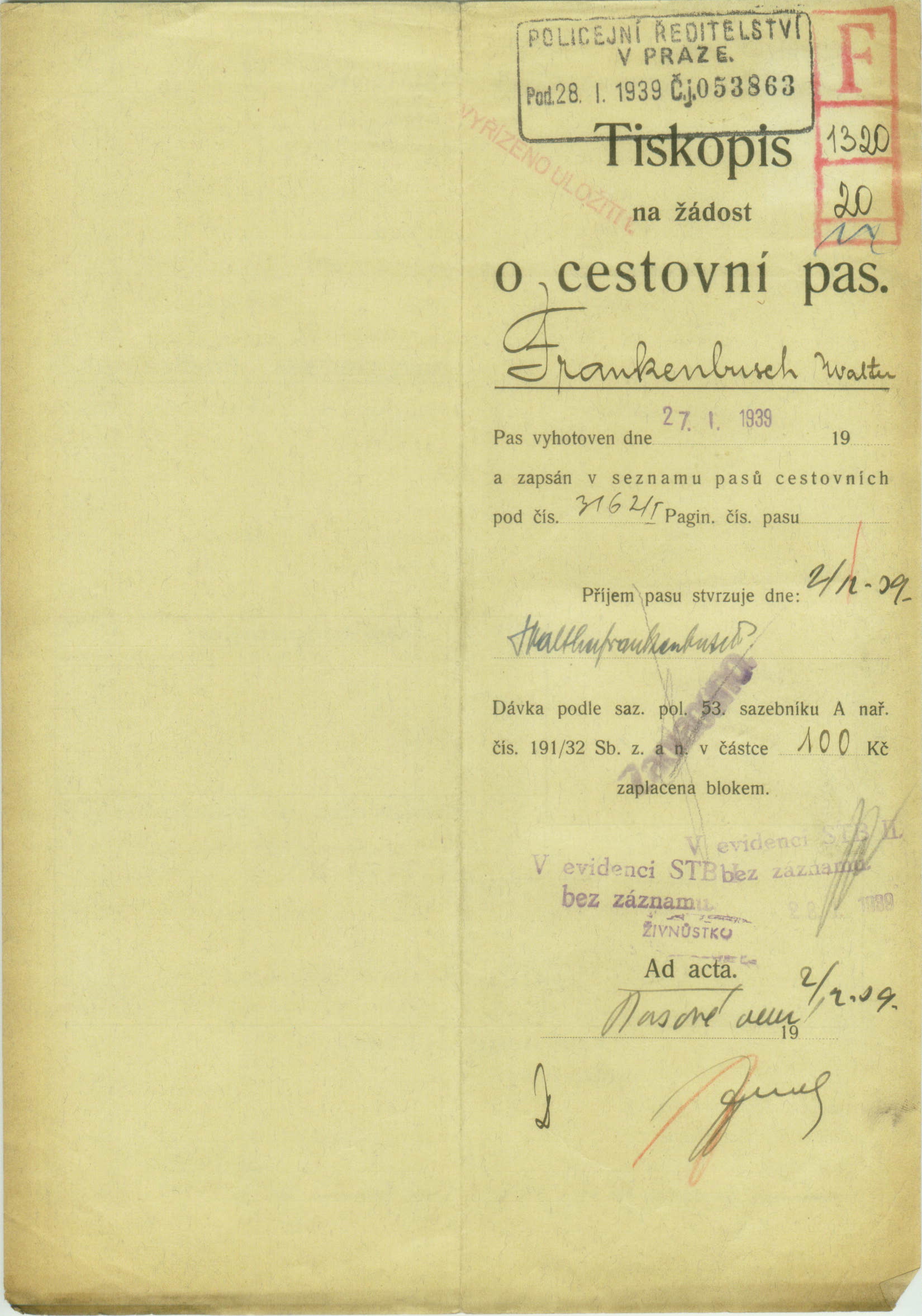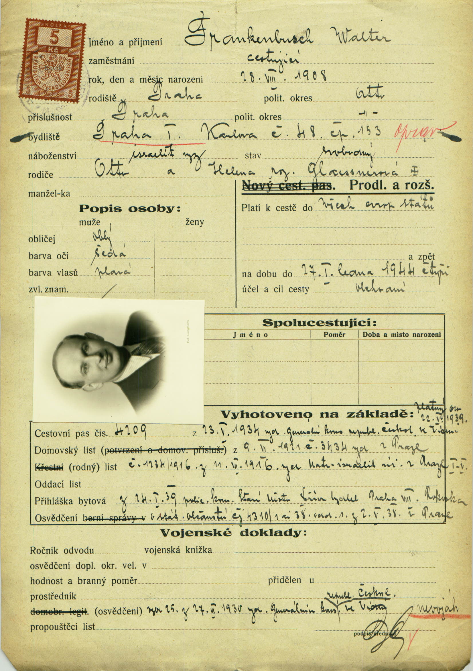Frankenbusch Walter Ernst: Žádost o prodloužení a rozšíření cestovního pasu
