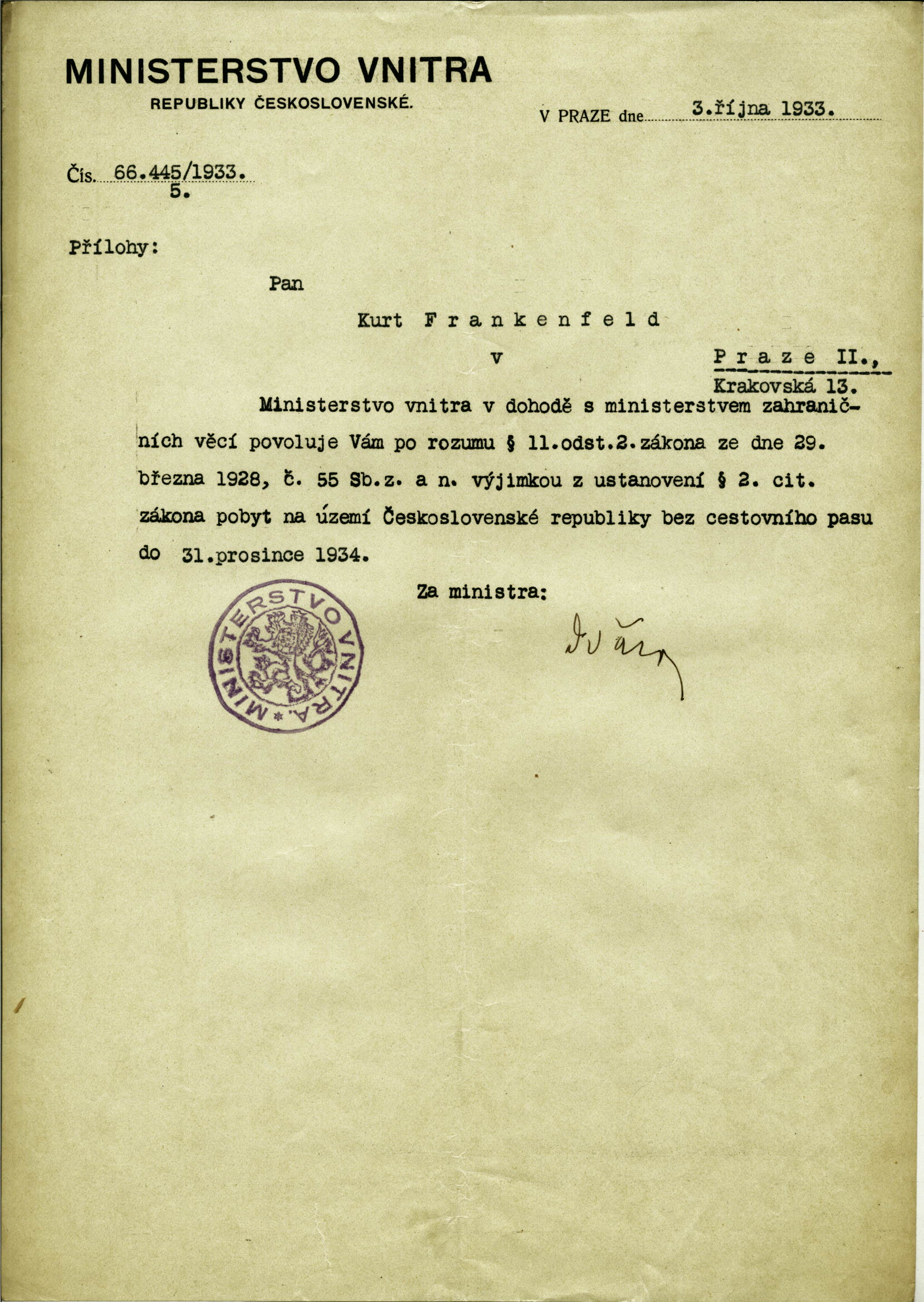 Frankenfeld Kurt: Povolení pobytu