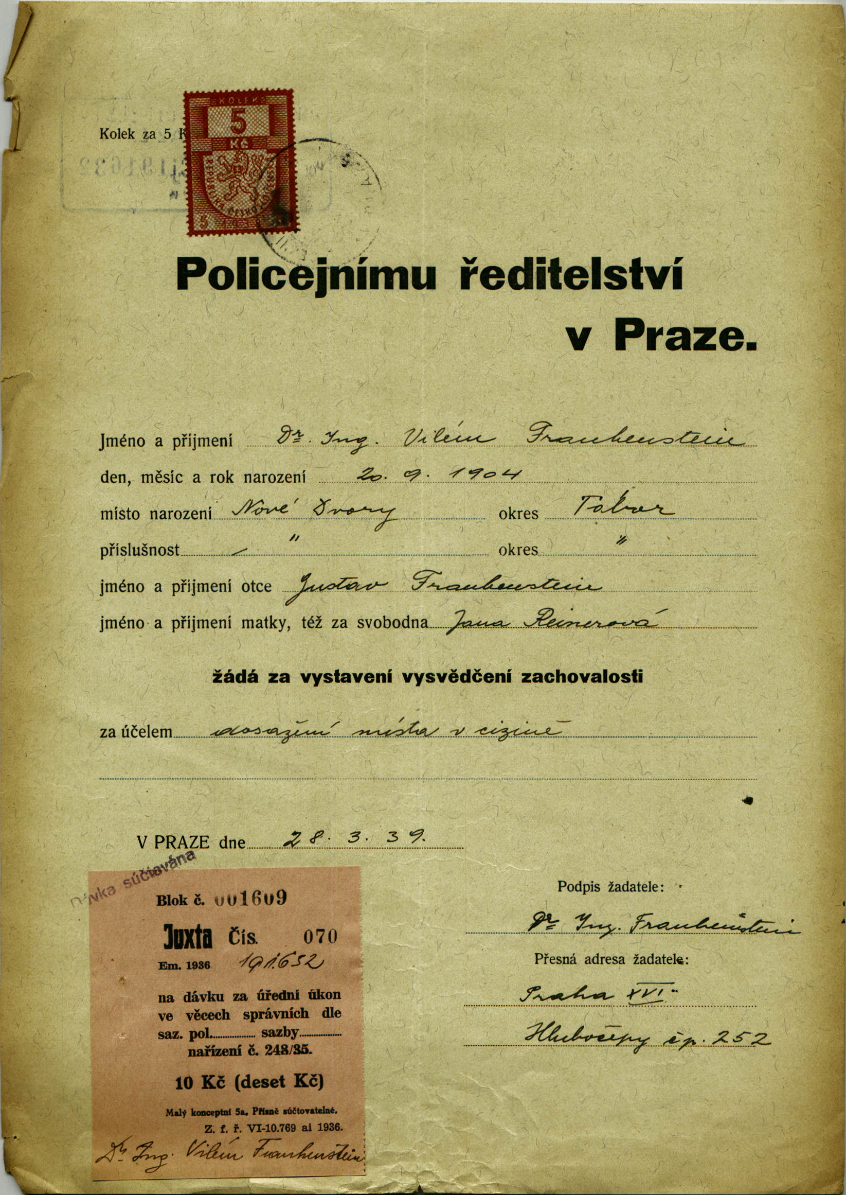 Frankenstein Vilém: Application for probity certificate