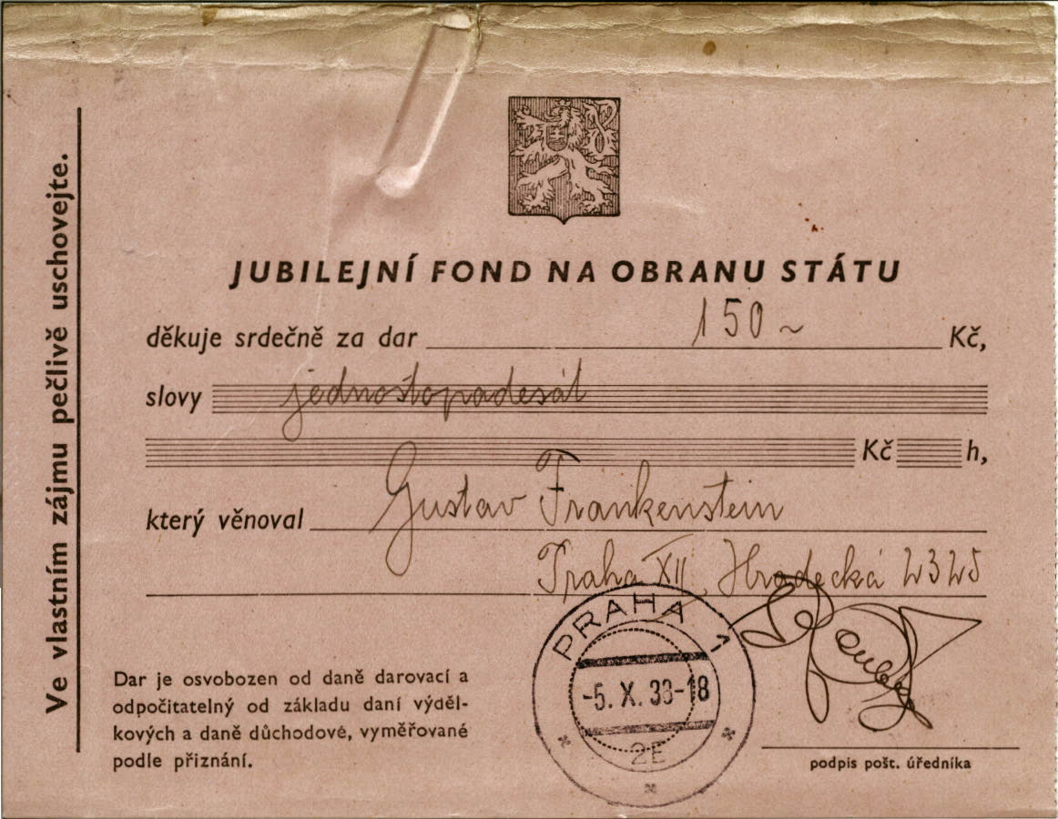Frankenstein Gustav: Potvrzení o přijetí daru