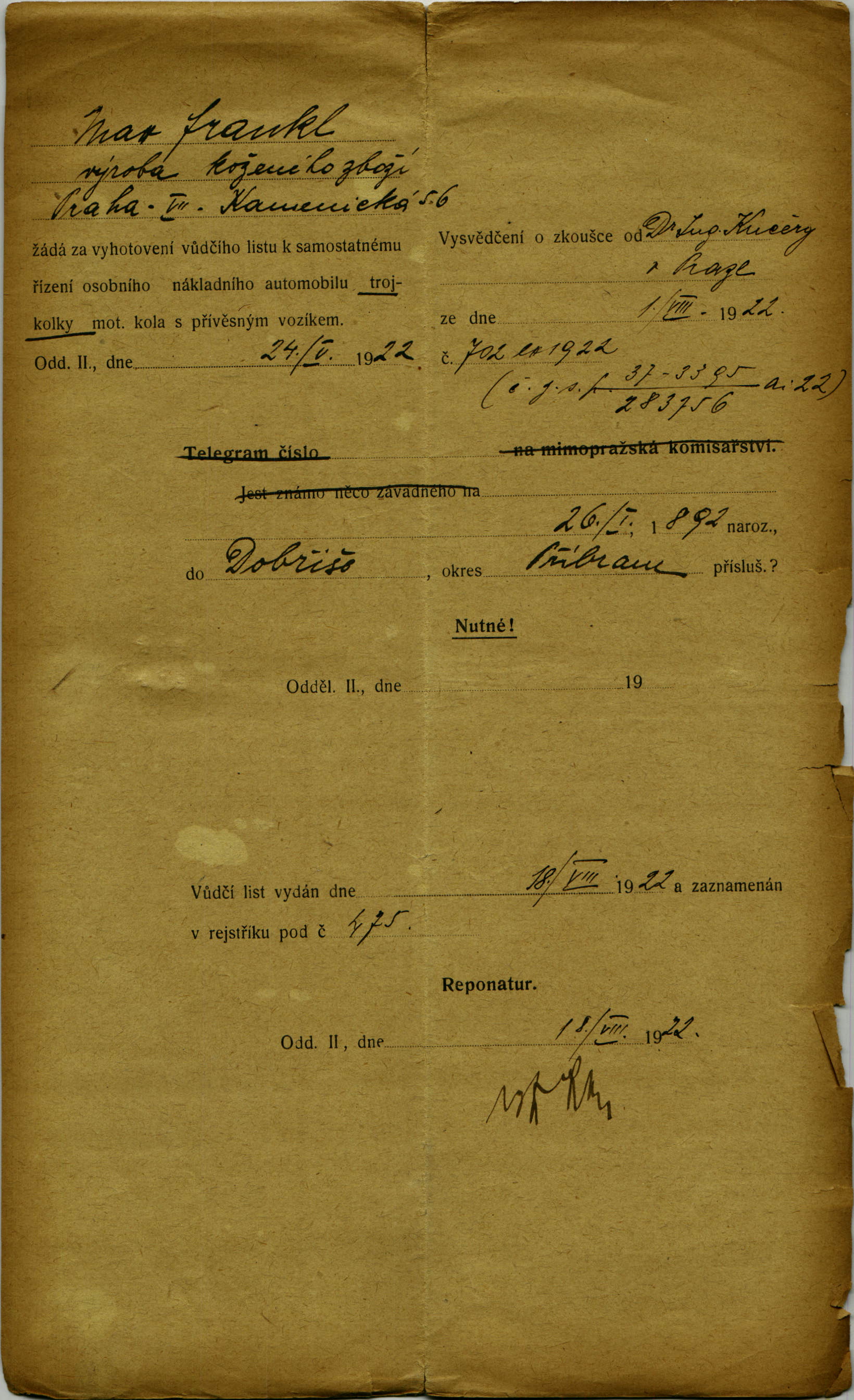 Frankl Maxmilian: Žádost o vydání řidičského průkazu