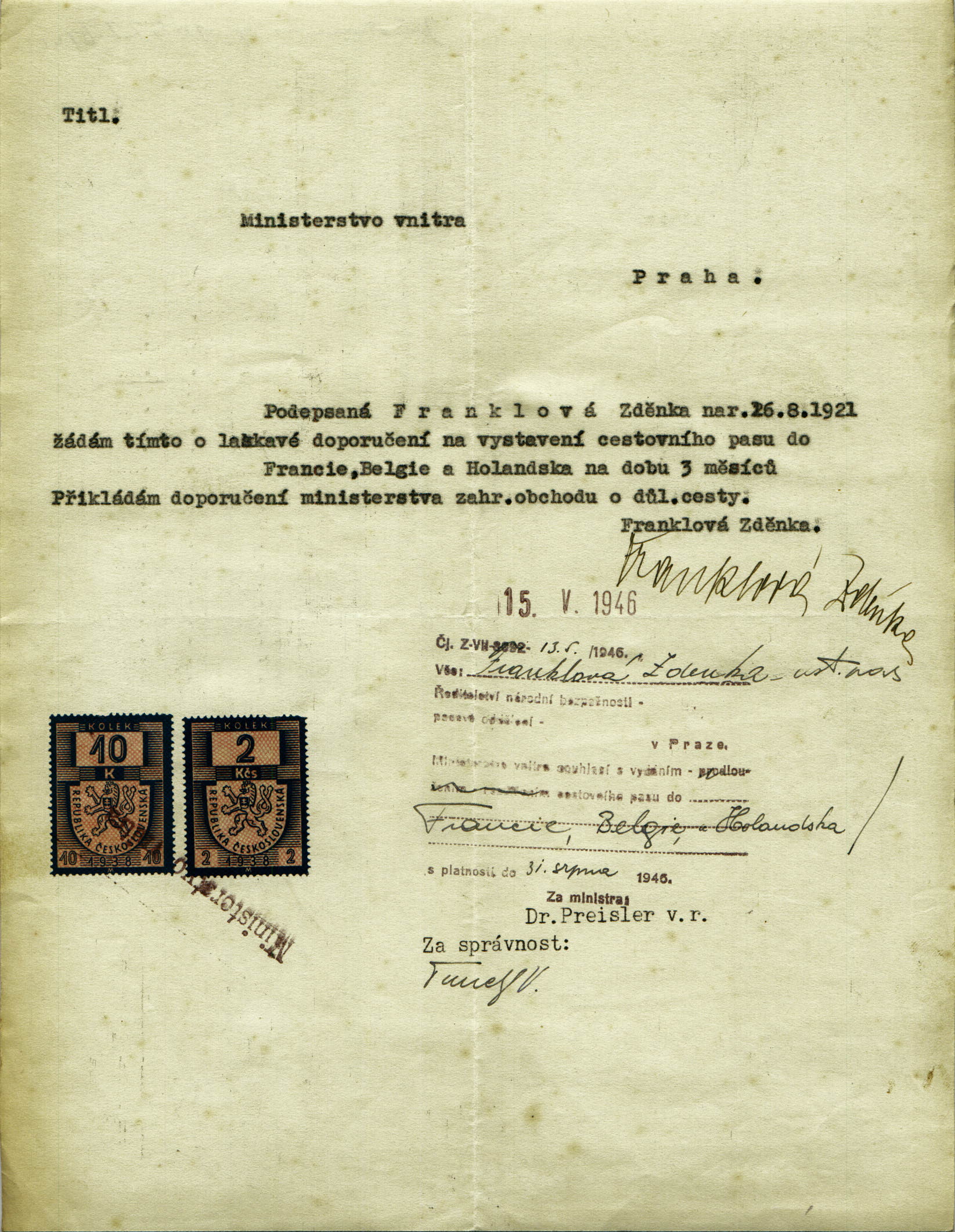 Franklová Zdena: Žádost o souhlas s vydáním cestovního pasu