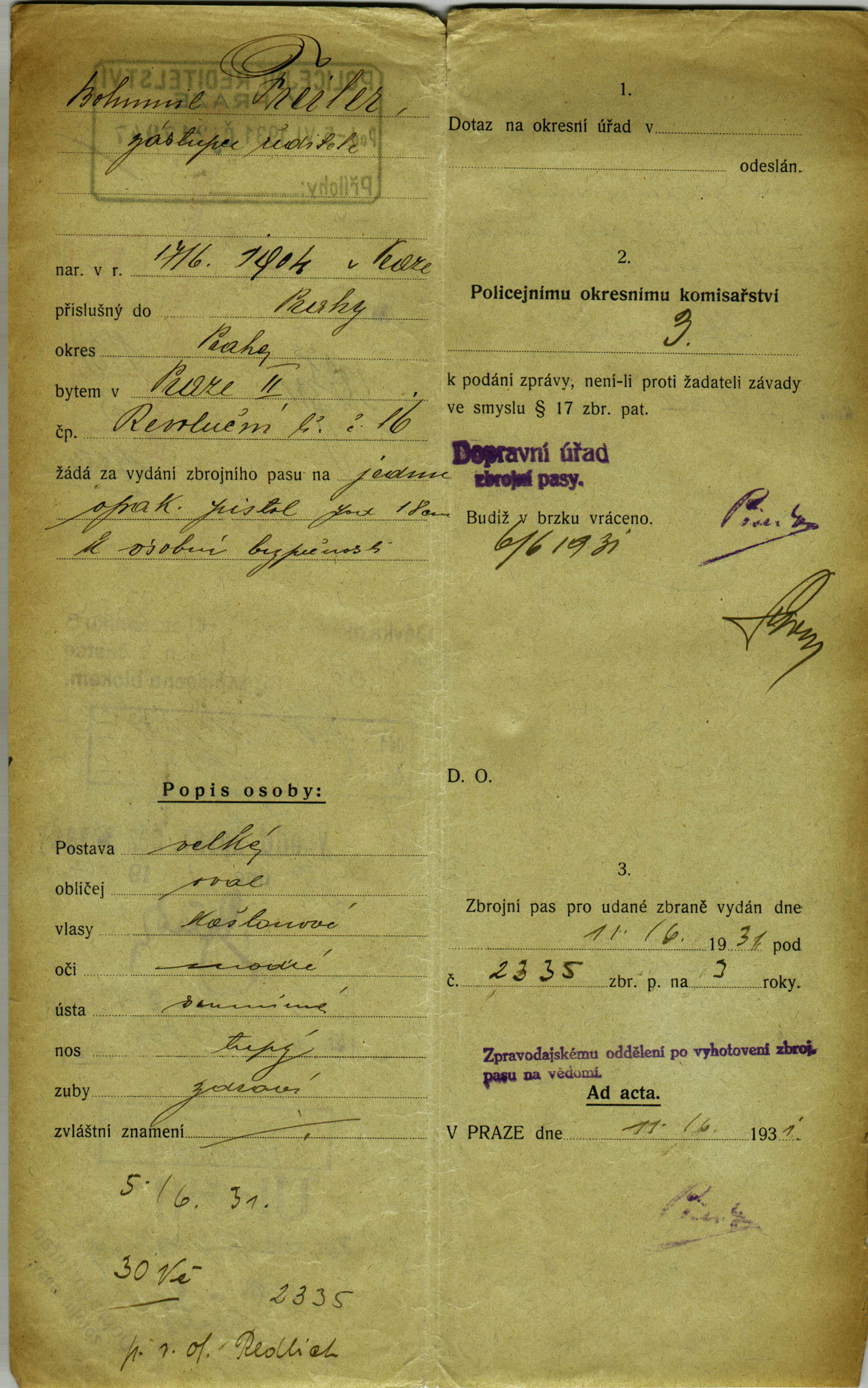 Freiler Bohumil: Žádost o vydání zbrojního pasu