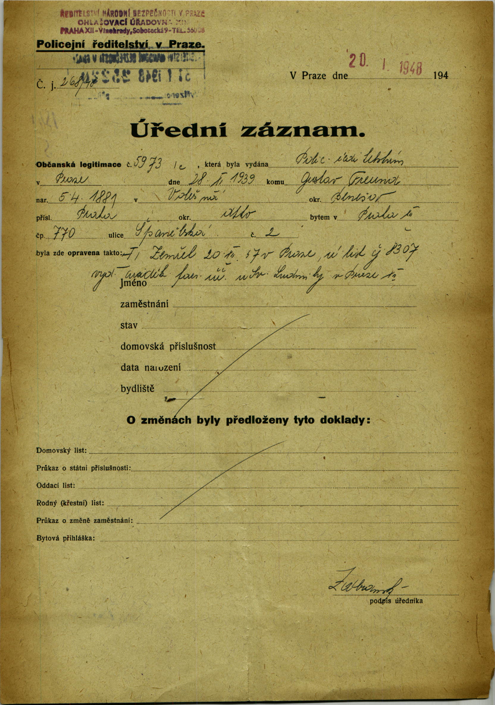 Freund Gustav: Žádost o opravu v občanské legitimaci
