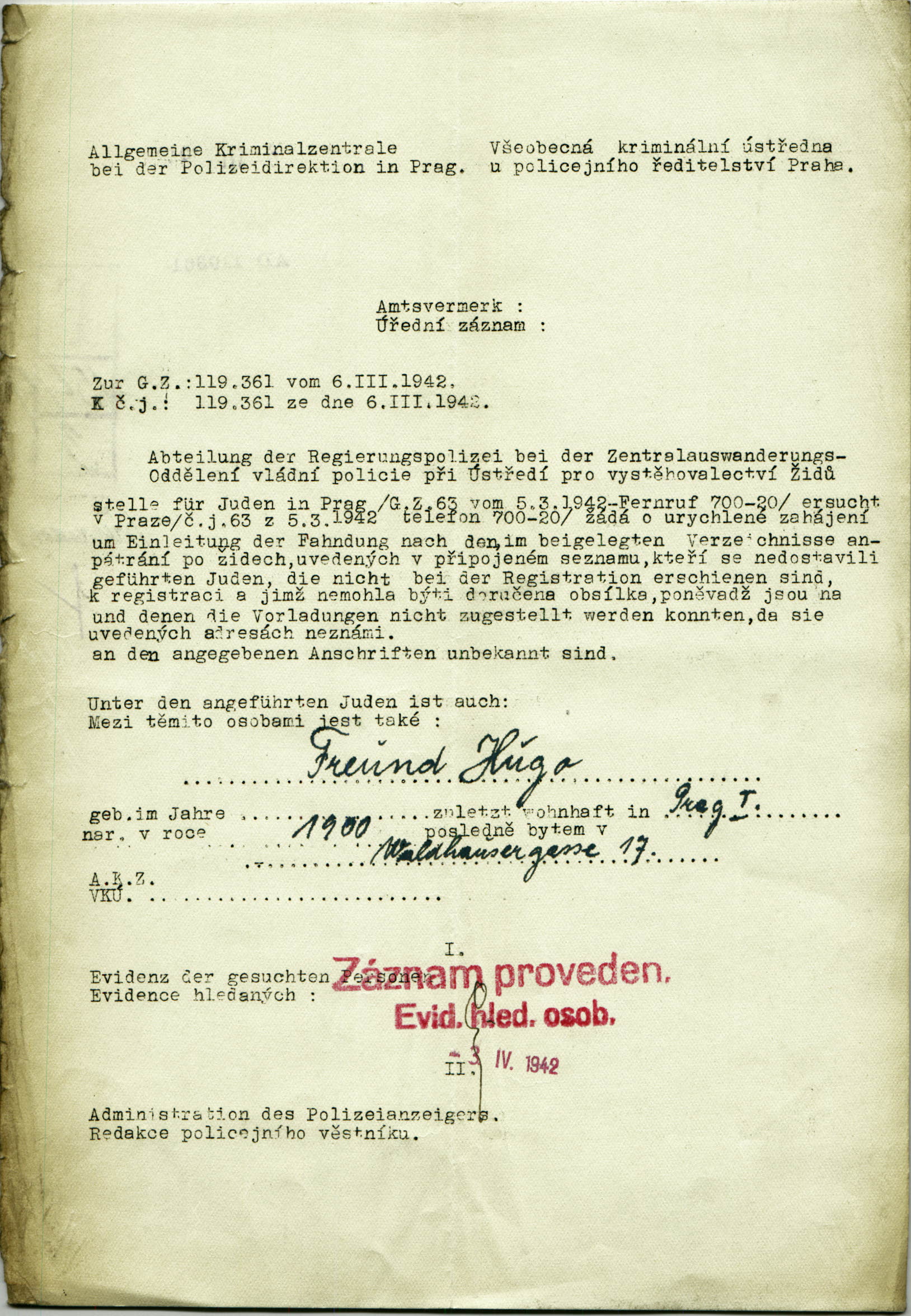Freund Hugo: Pátrání po neregistrovaných Židech