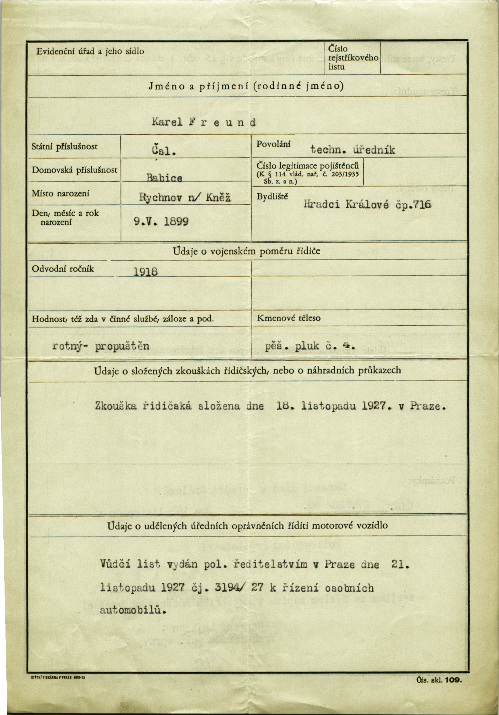 Freund Karl: Data k zápisu do rejstříku motorových vozidel