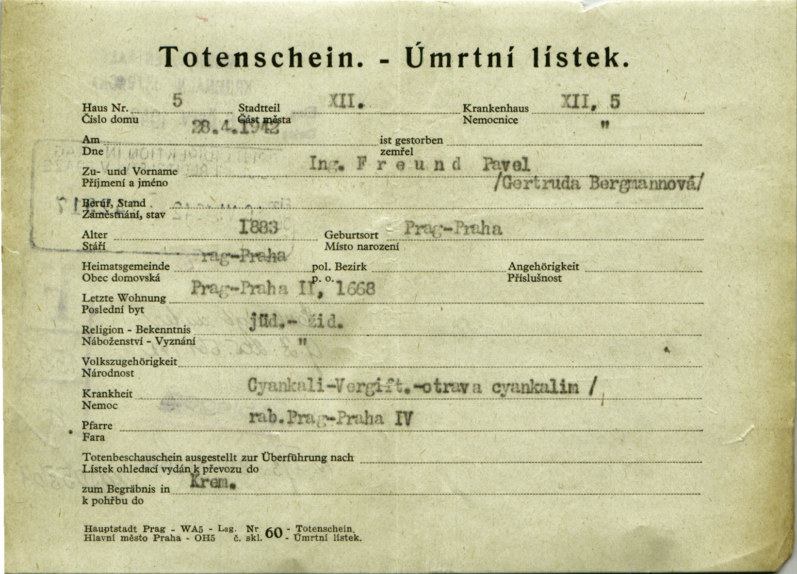 Freund Paul: Úmrtní lístek