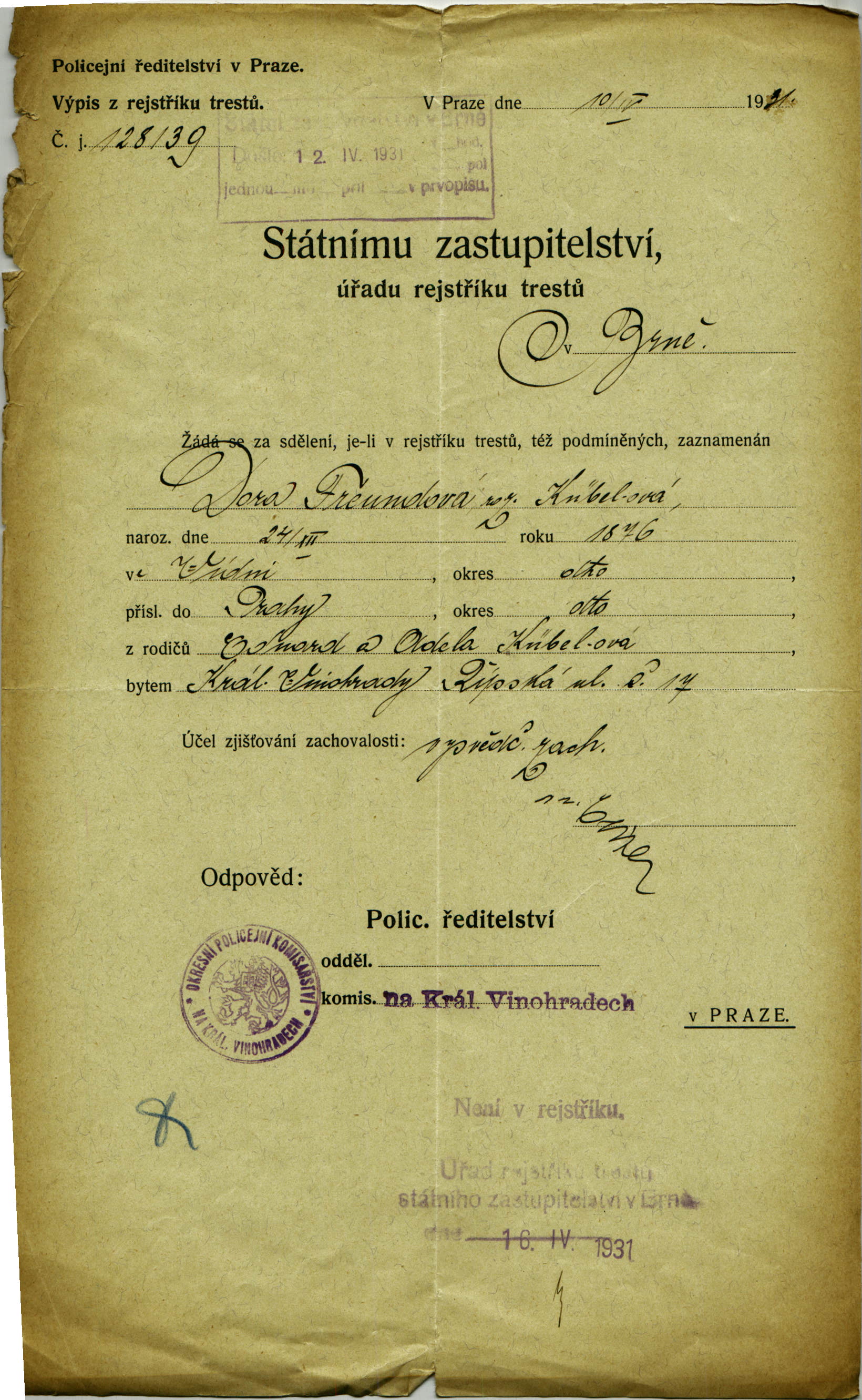 National archives Prague > Police Directorate Prague > 1941-1950 > F > Freundová Dora