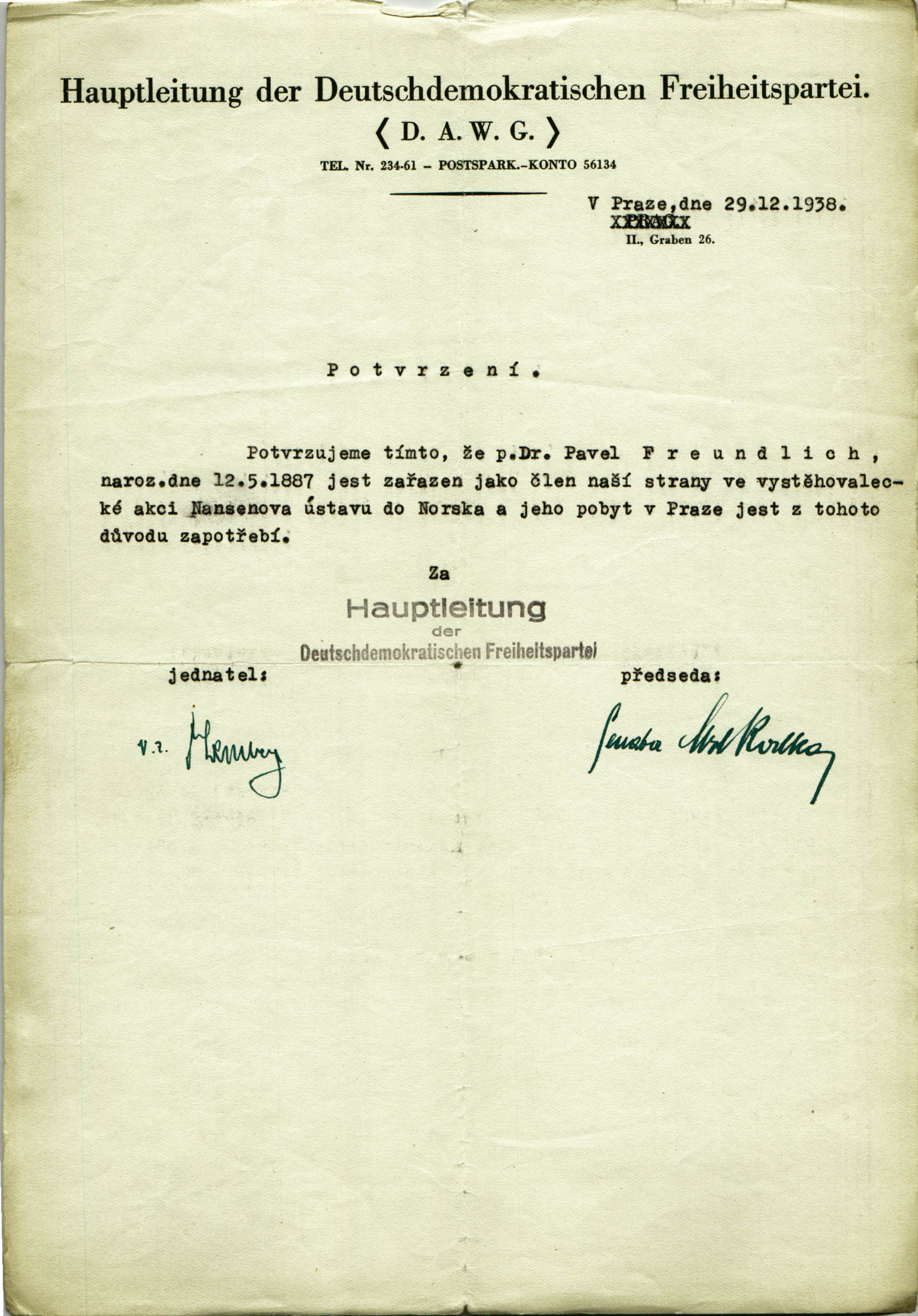Freundlich Pavel: Potvrzení o registraci k vystěhování