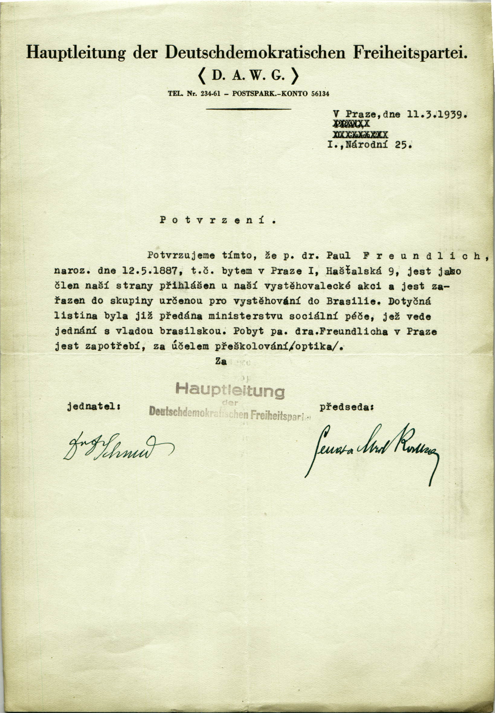 Freundlich Pavel: Potvrzení o registraci k vystěhování
