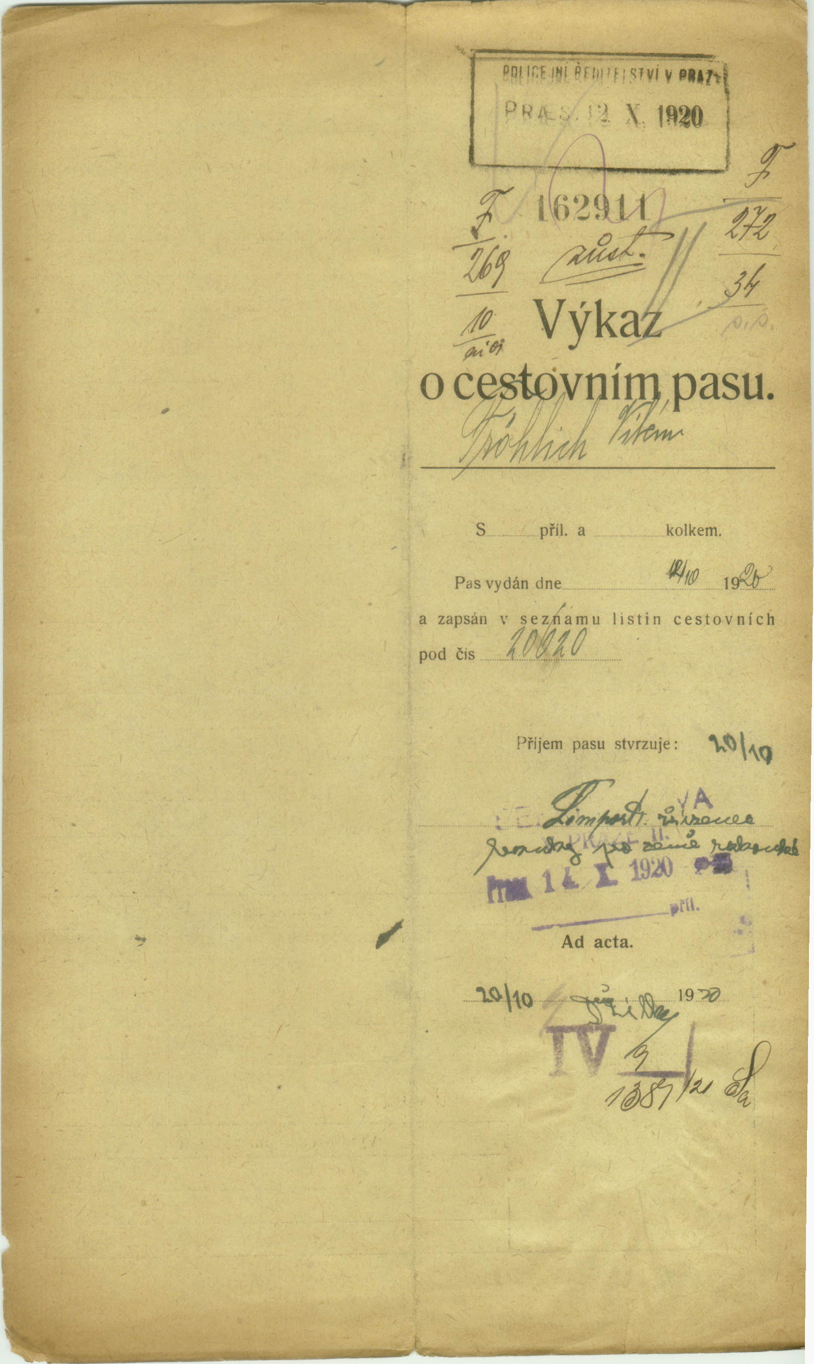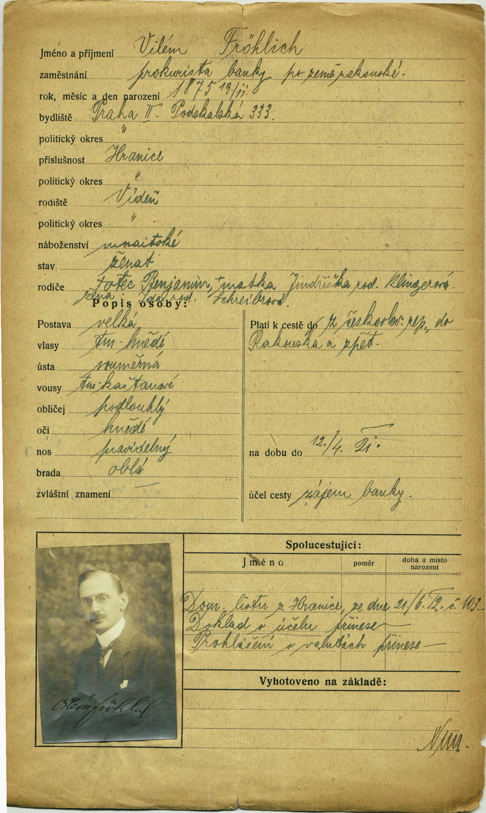 Fröhlich Vilém: Passport application