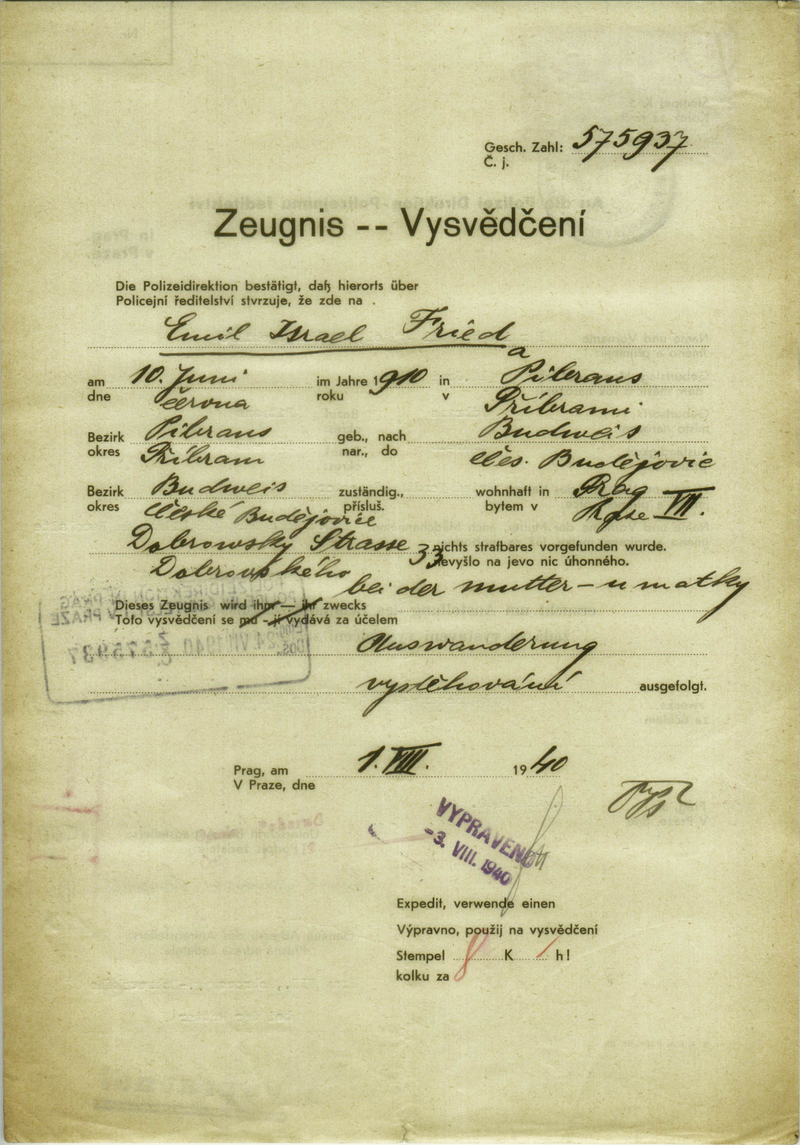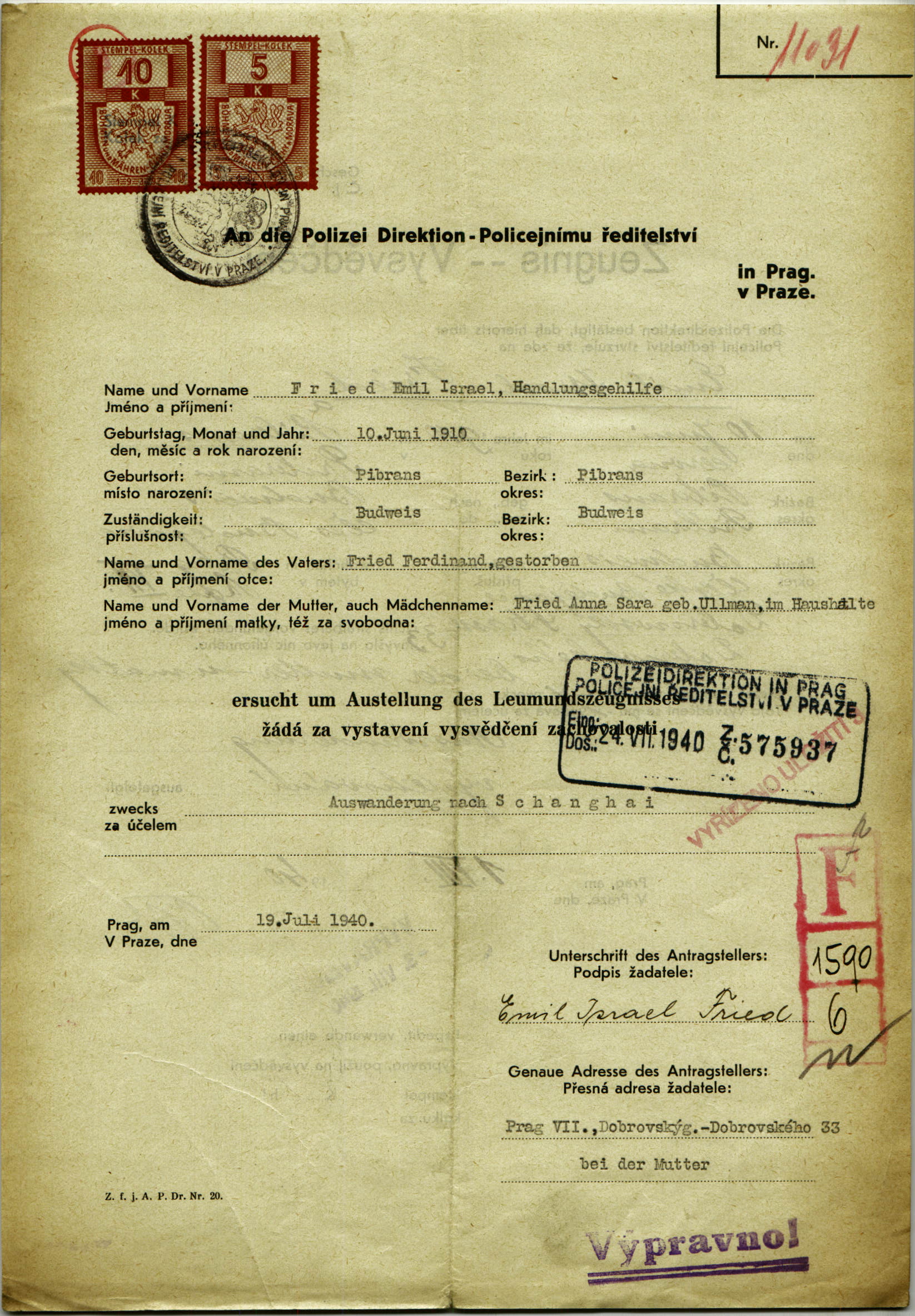 National archives Prague > Police Directorate Prague > 1941-1950 > F > Fried Emil