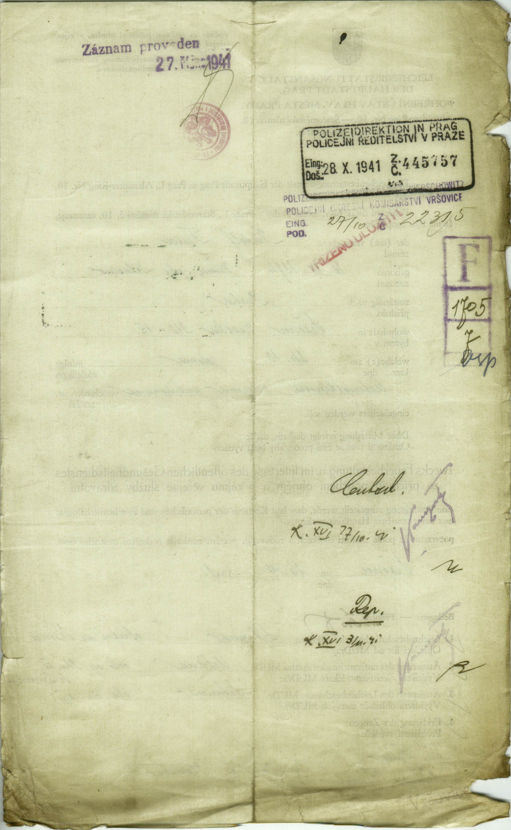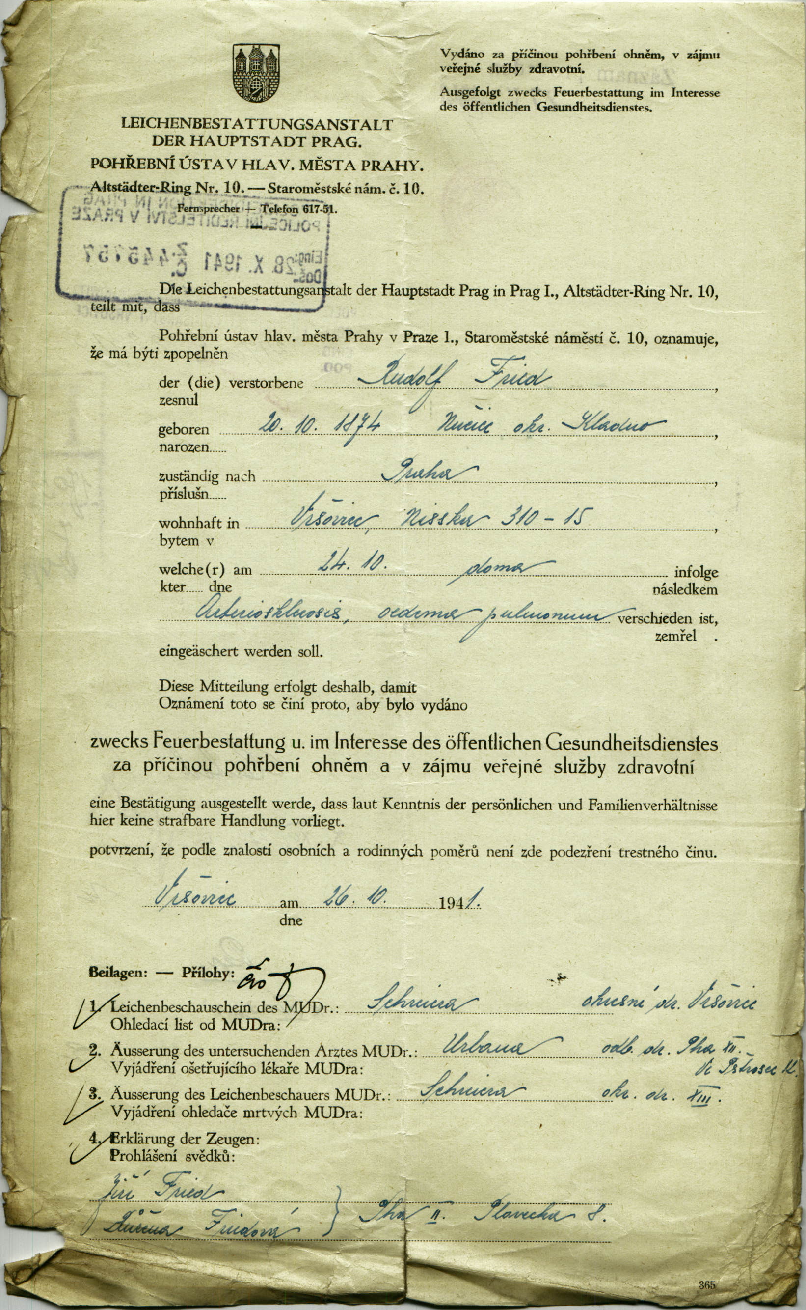 Fried Rudolf: Žádost o potvrzení k pohřbení ohněm