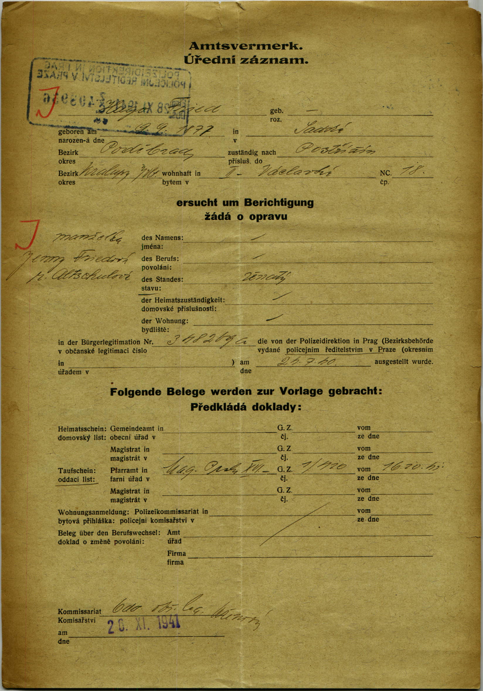 Fried Hugo: Žádost o opravu v občanské legitimaci