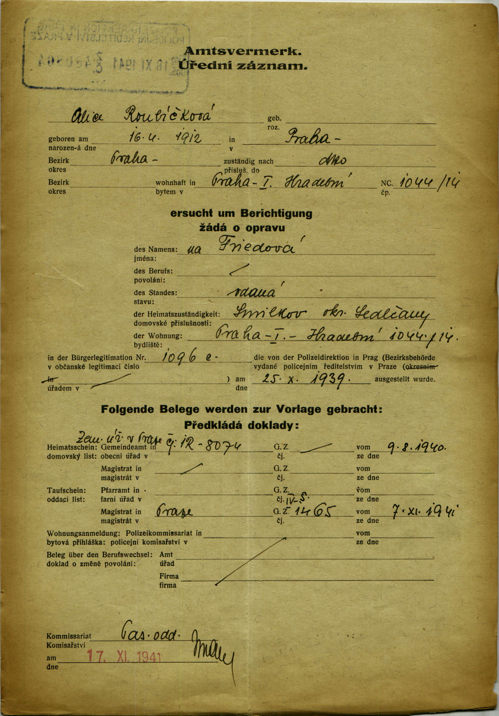 Friedová Alice: Žádost o opravu v občanské legitimaci