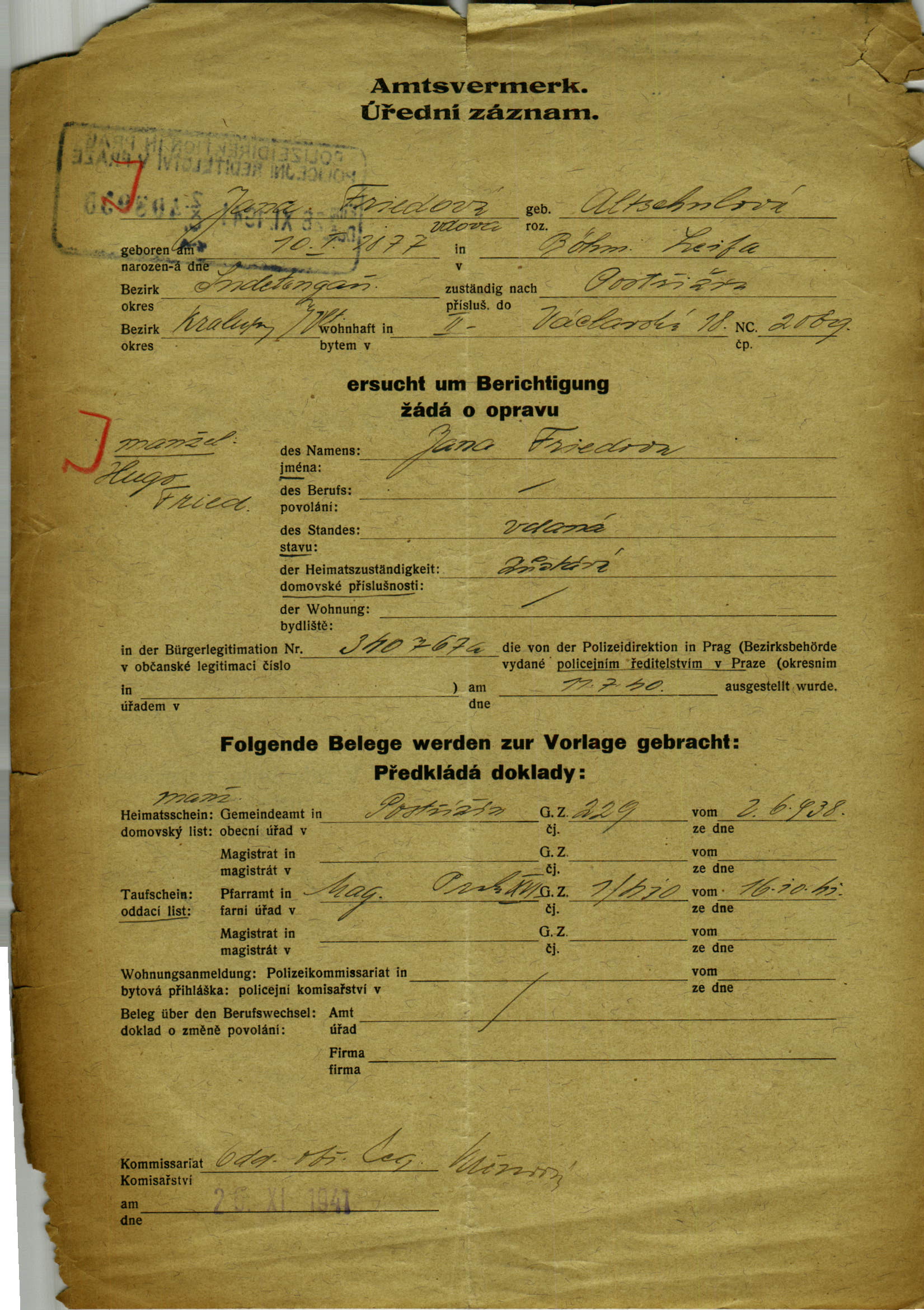 Friedová Jana: Žádost o opravu v občanské legitimaci