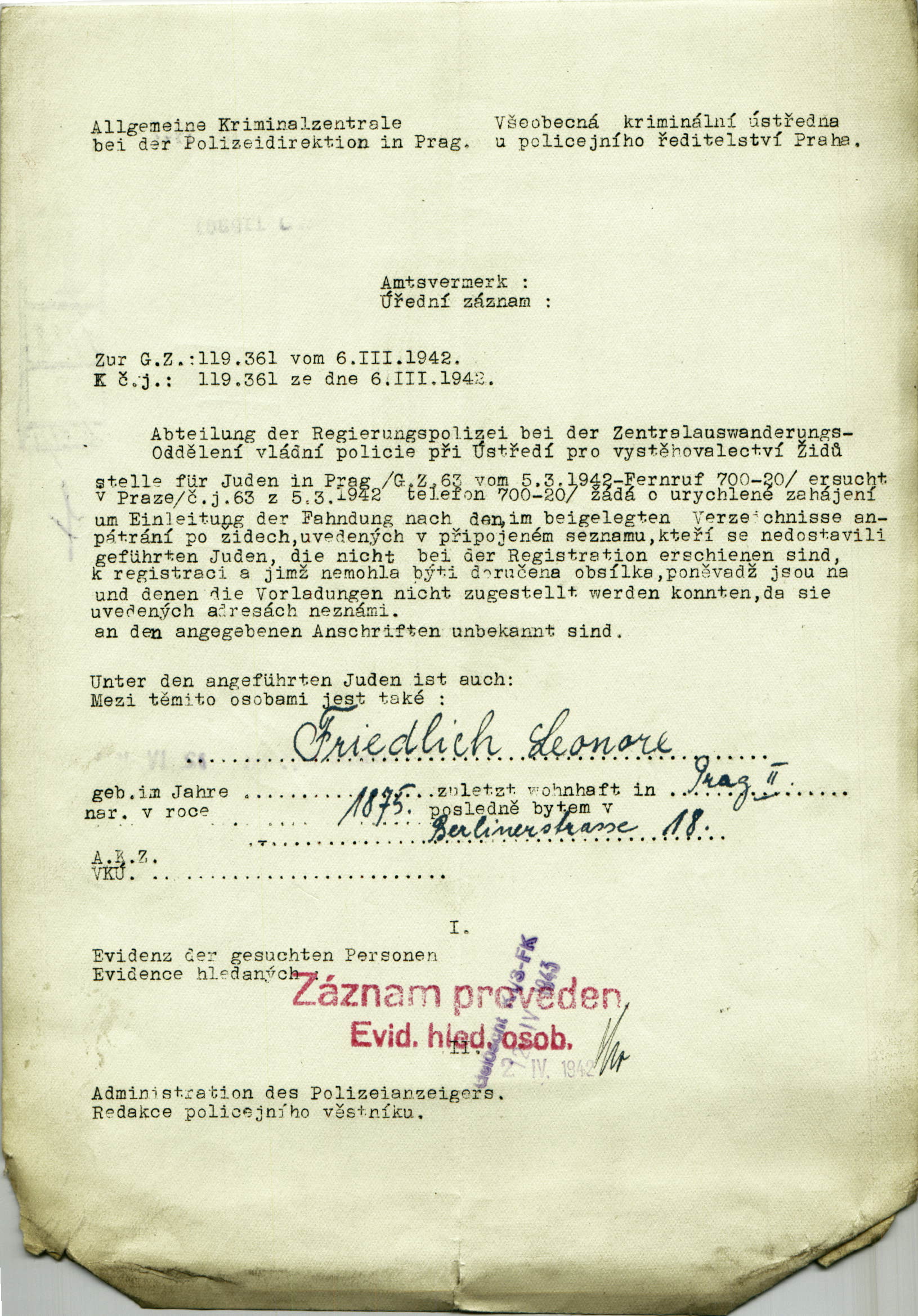 Friedlichová Leonore: Žádost o zahájení pátrání