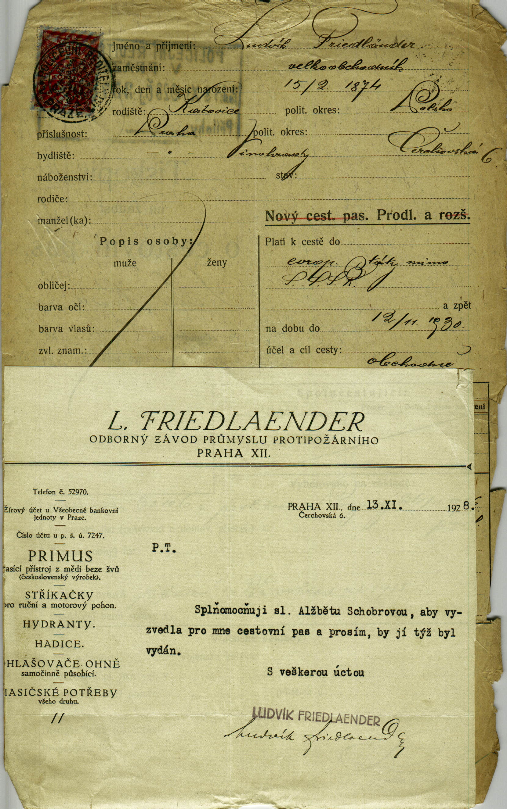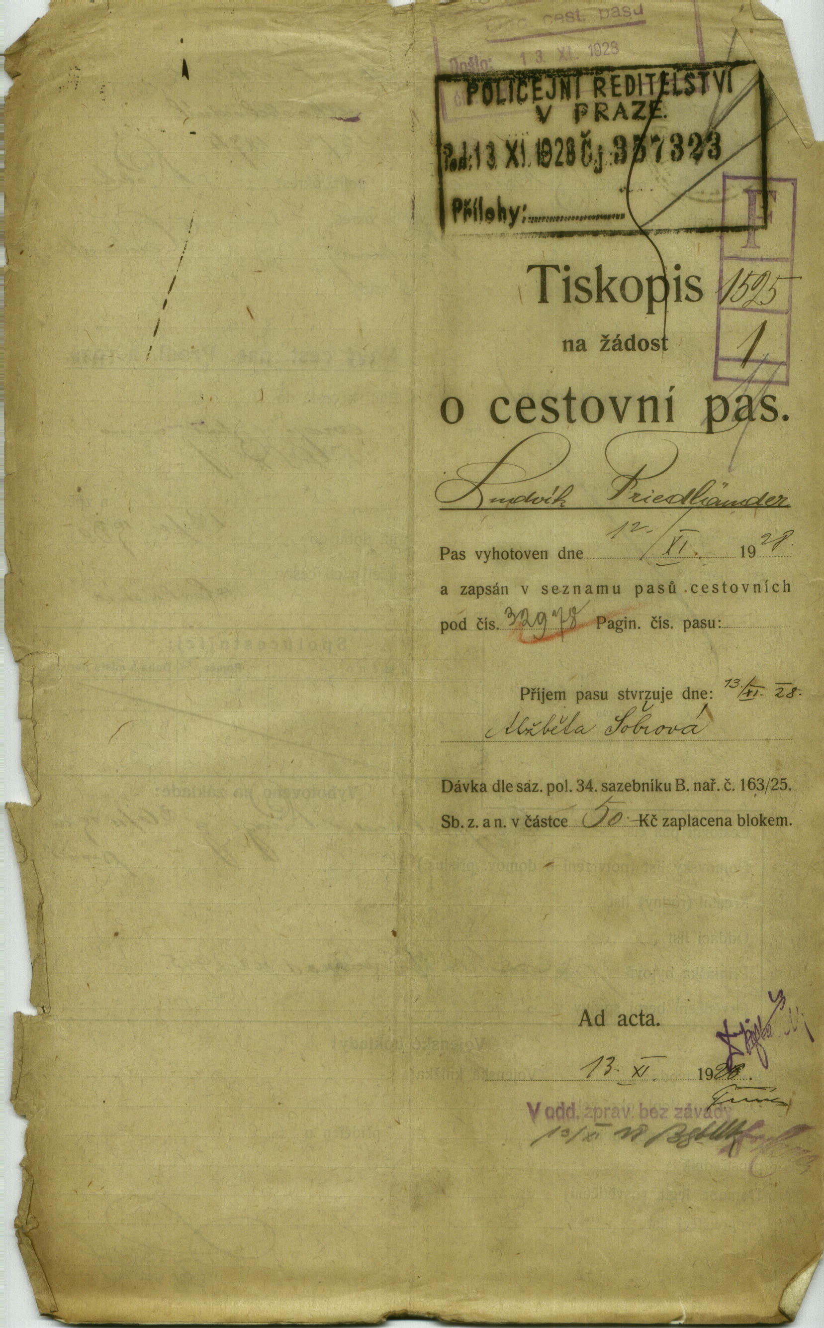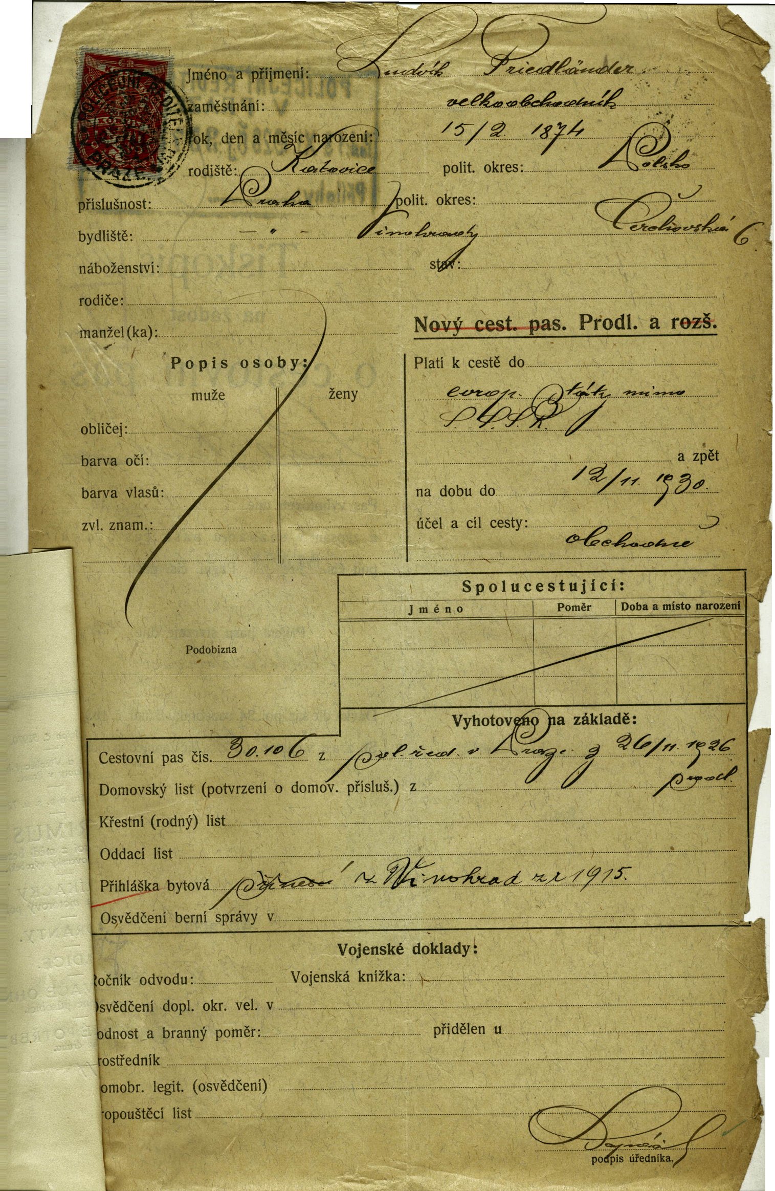 Friedländer Ludvík: Žádost o prodloužení a rozšíření cestovního pasu