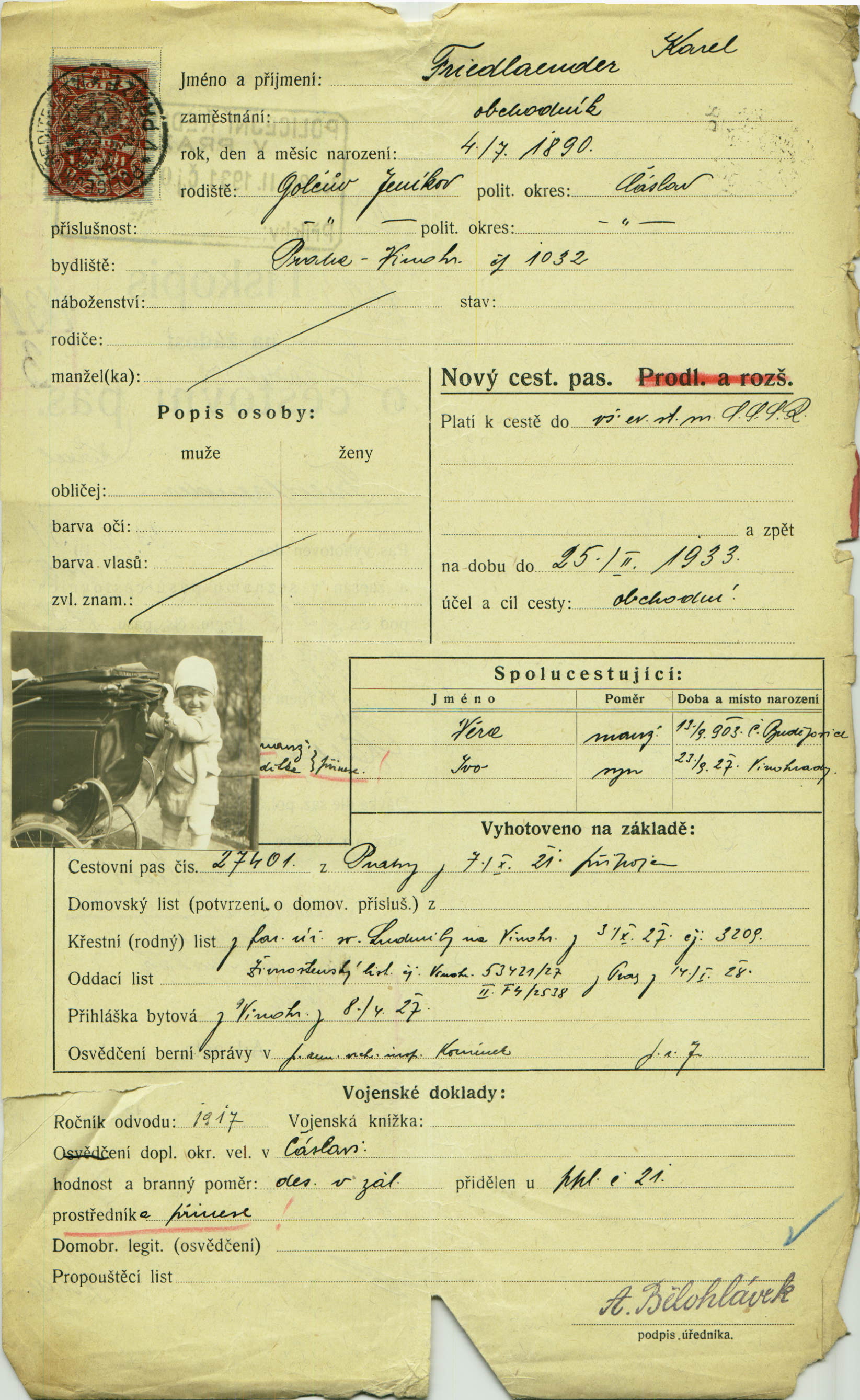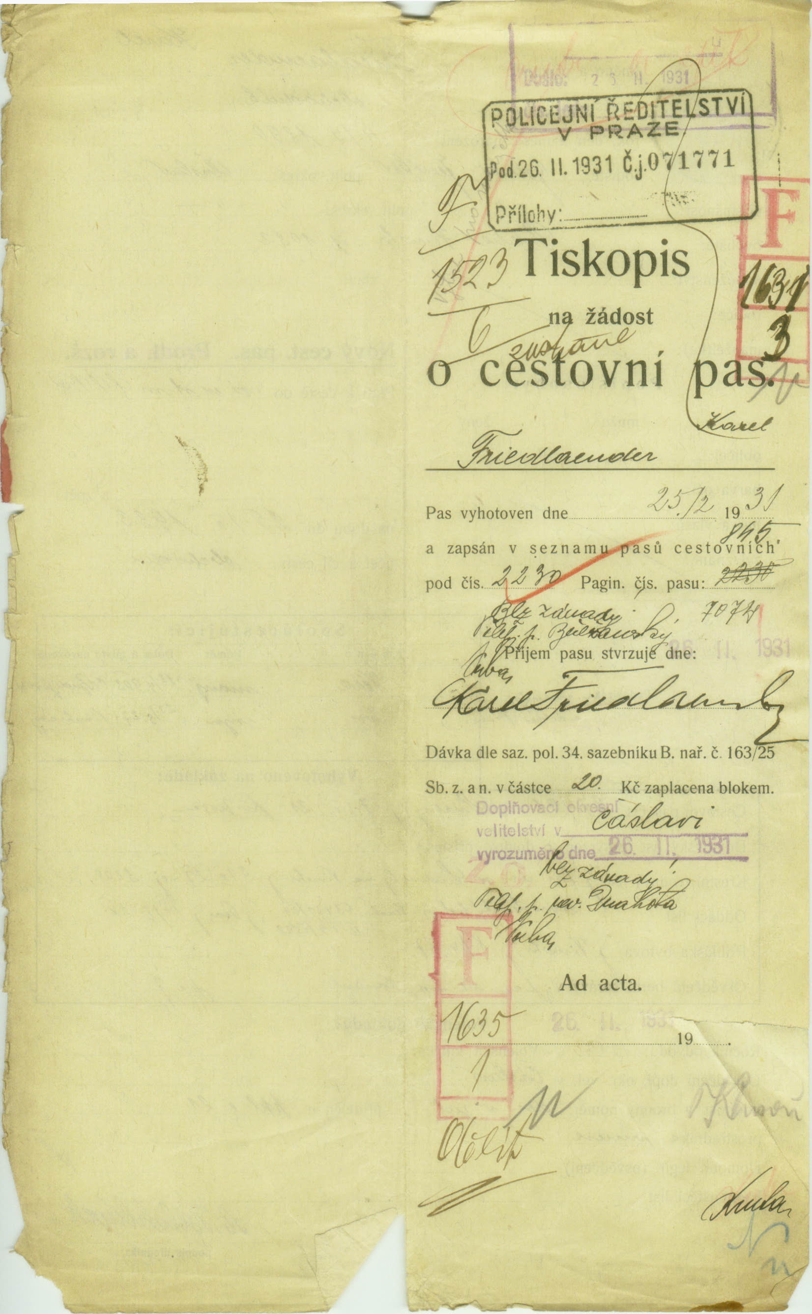 Friedländer Karel: Passport application