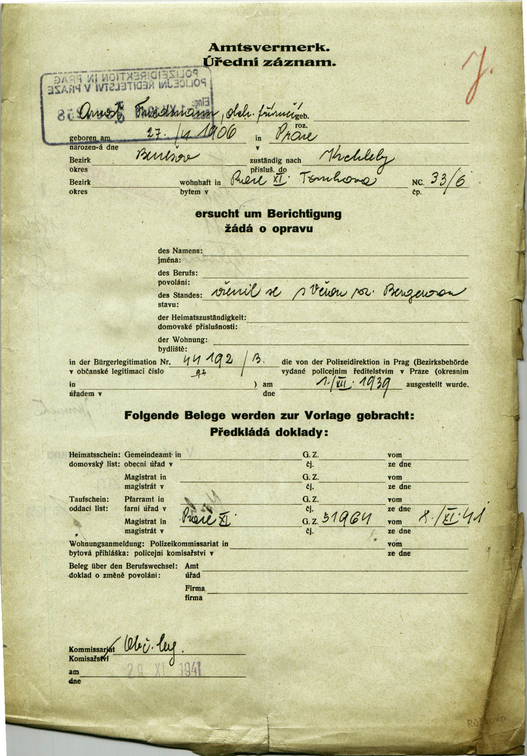 Friedmann Arnošt: Žádost o opravu v občanské legitimaci
