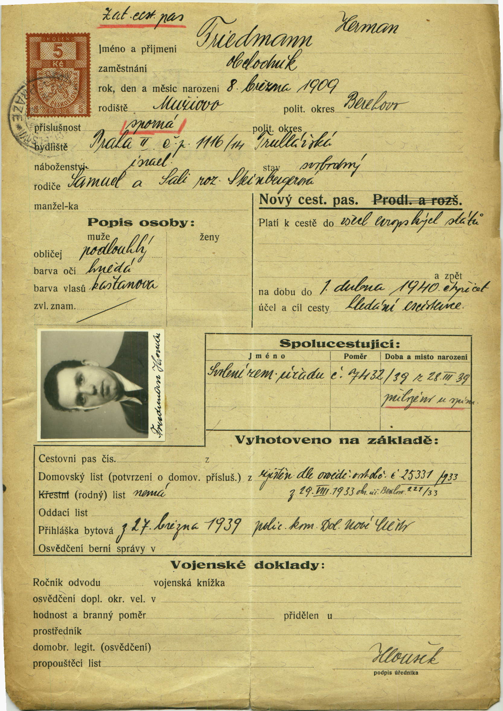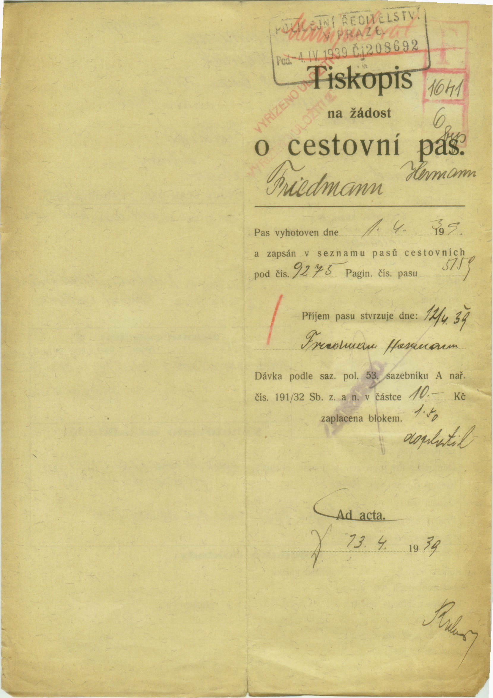Friedmann Heřman: Passport application