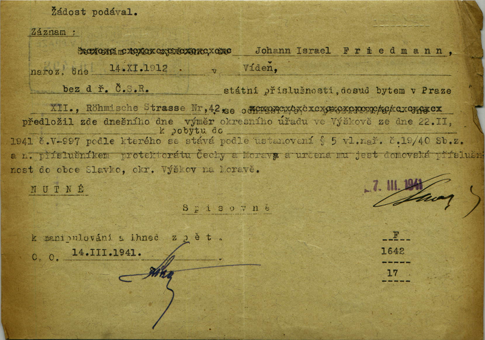 Friedmann Jan: Potvrzení o předložení osvědčení o státní přslušnosti