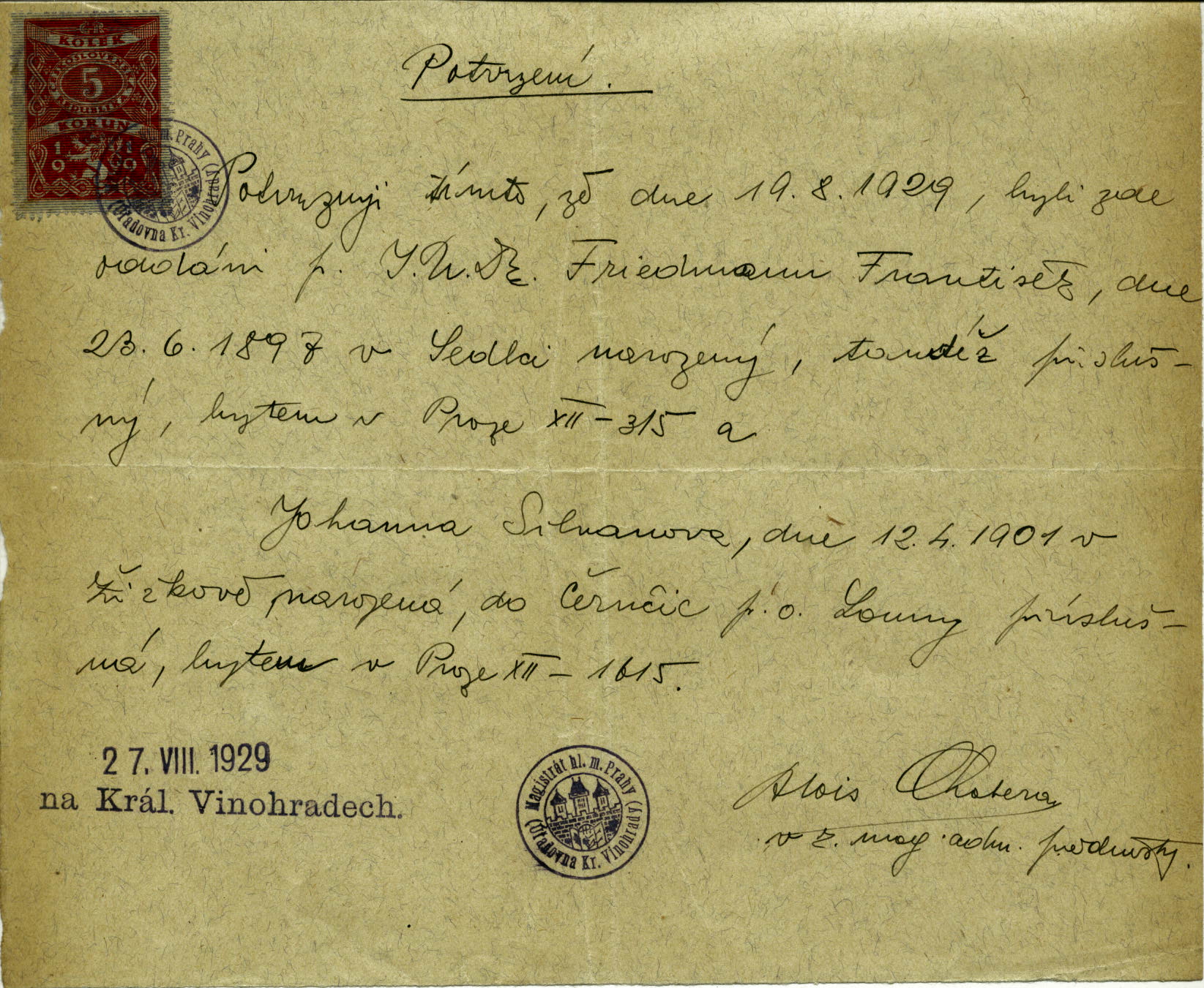 Friedmann Franz: Potvrzení sňatku