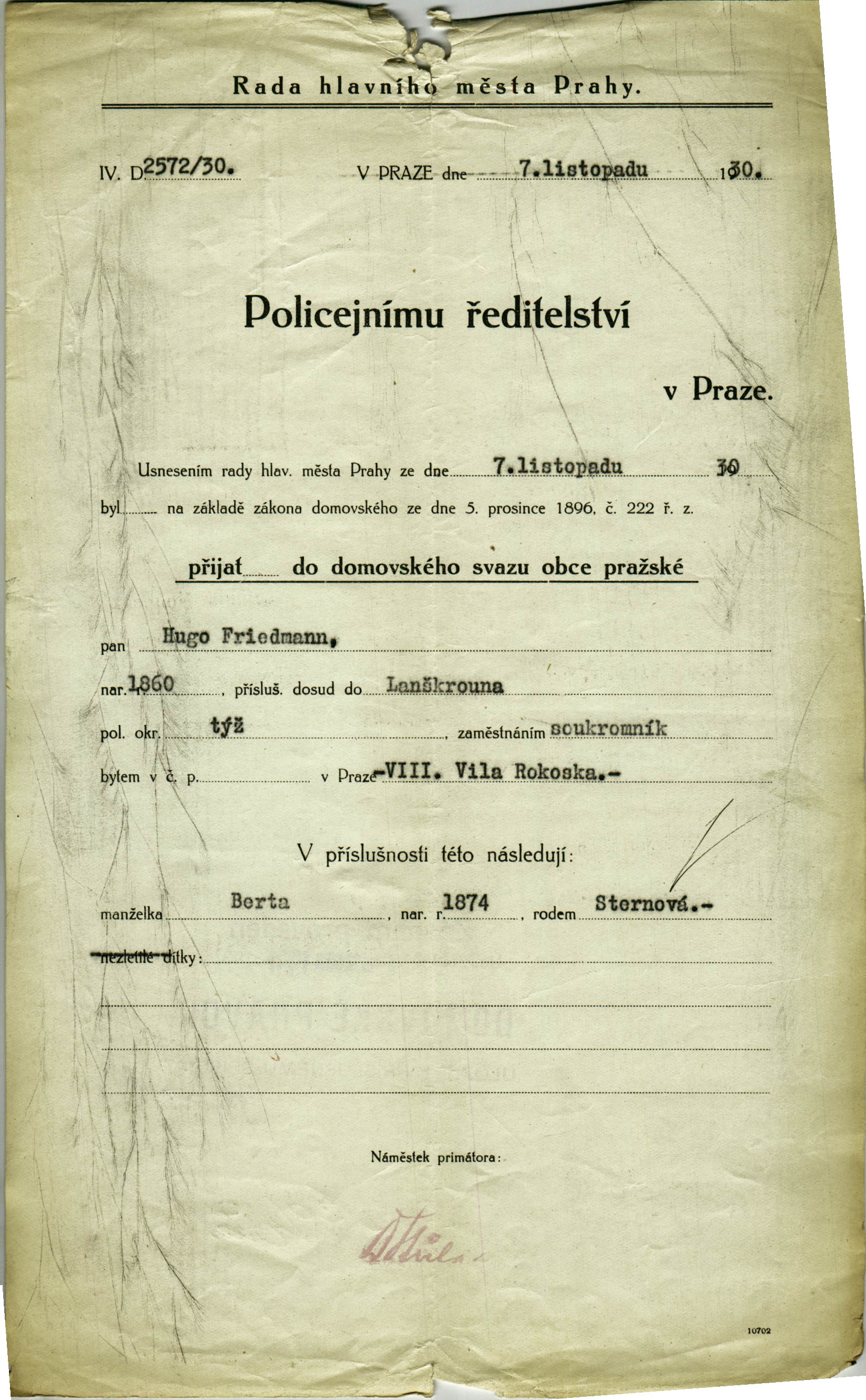 Friedmann Hugo: Nabytí domovského práva